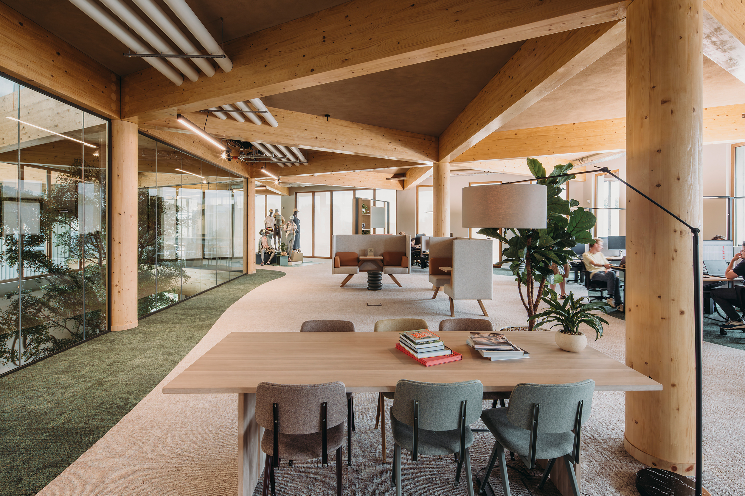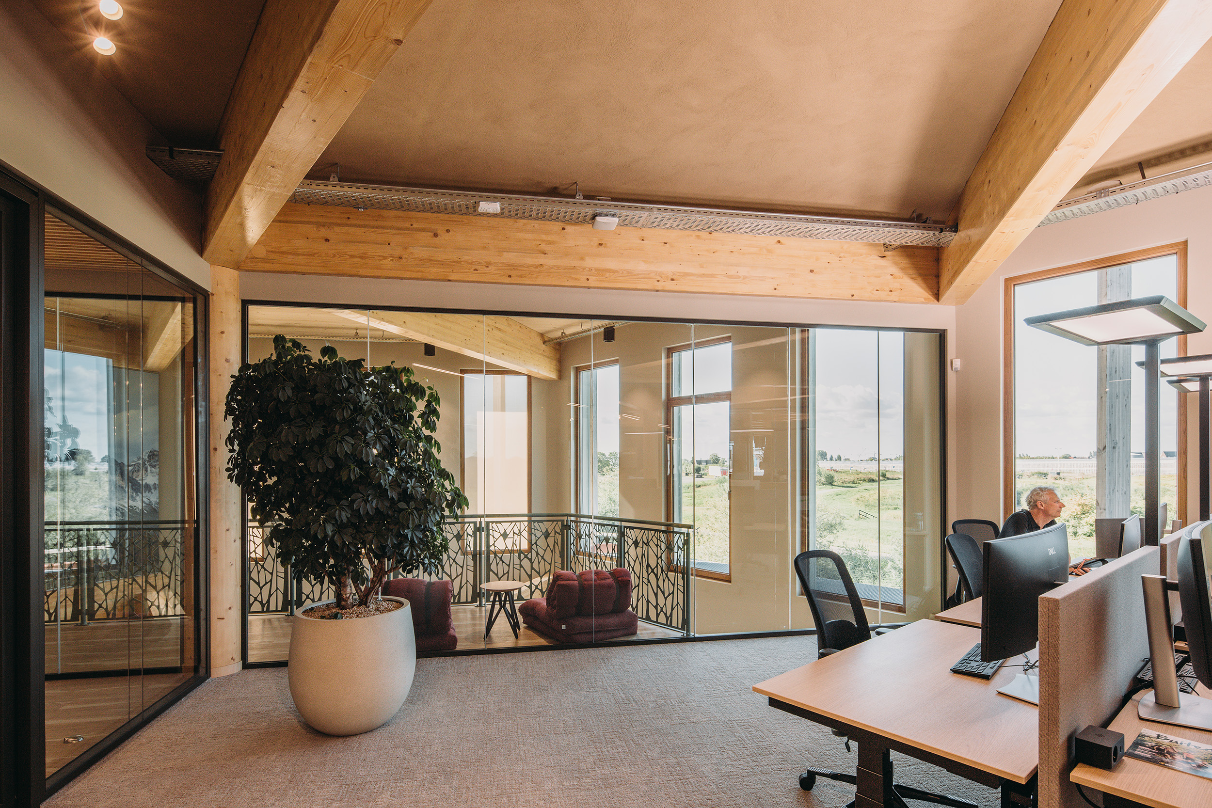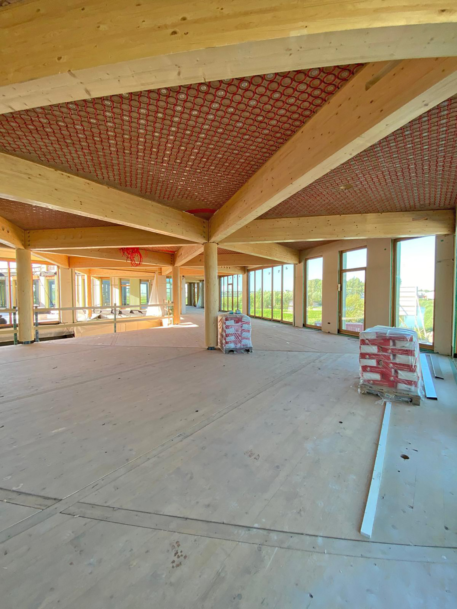 Niederländischer Outdoor-Spezialist setzt am Hauptsitz auf 1.270 m2 Natur-Klimadecke von Argillatherm / Holzrippen-Konstruktion in Wabenform