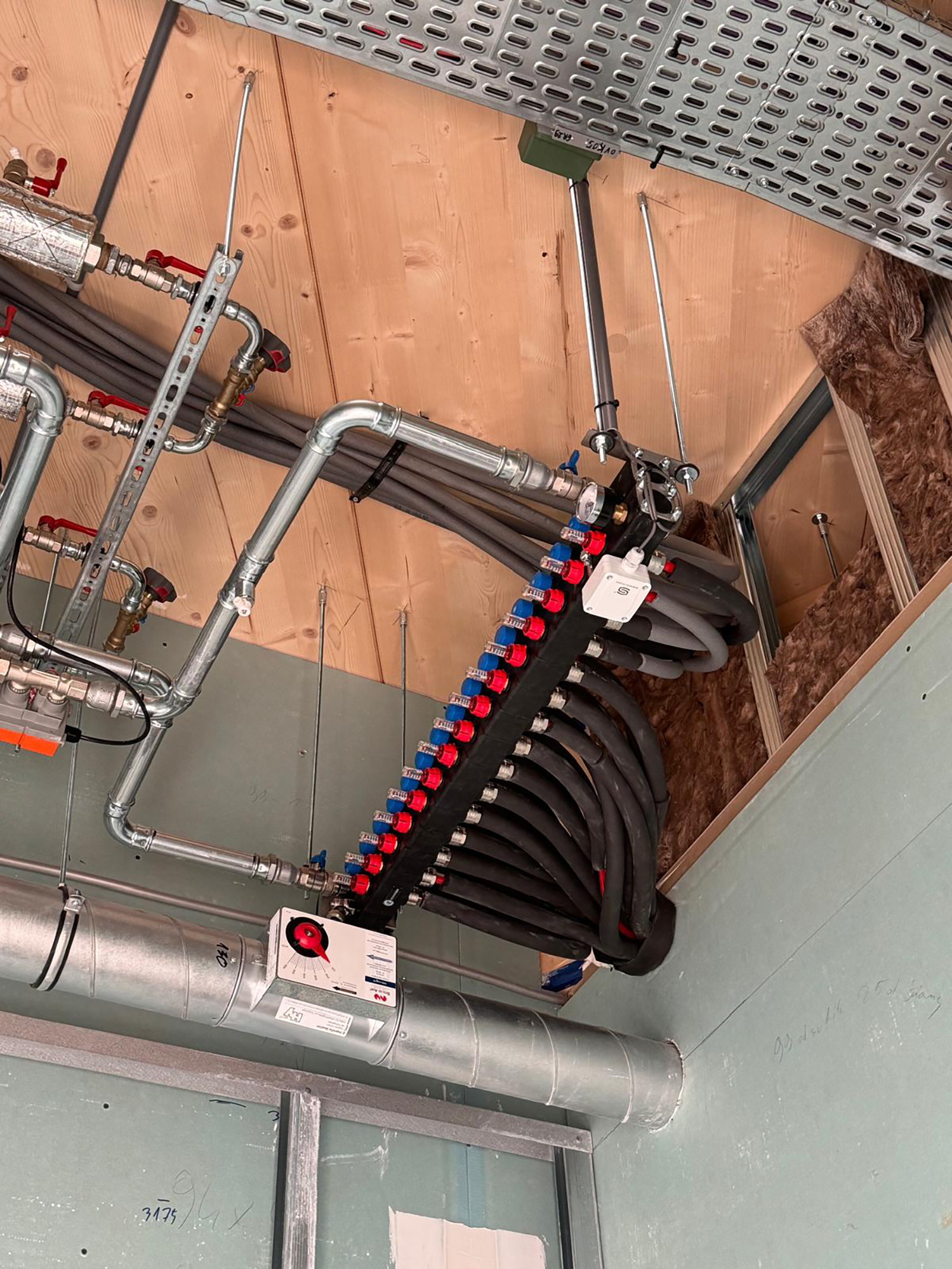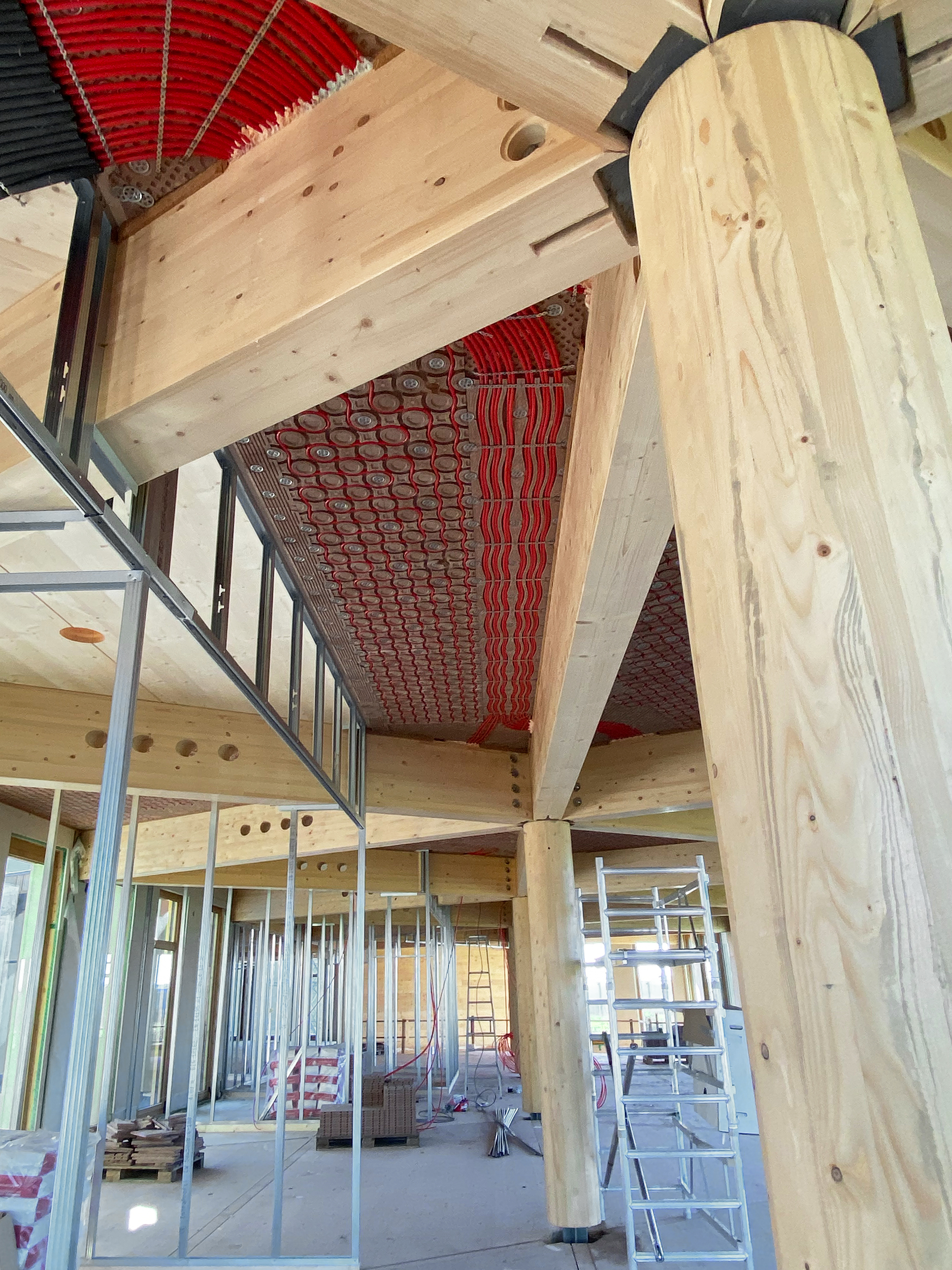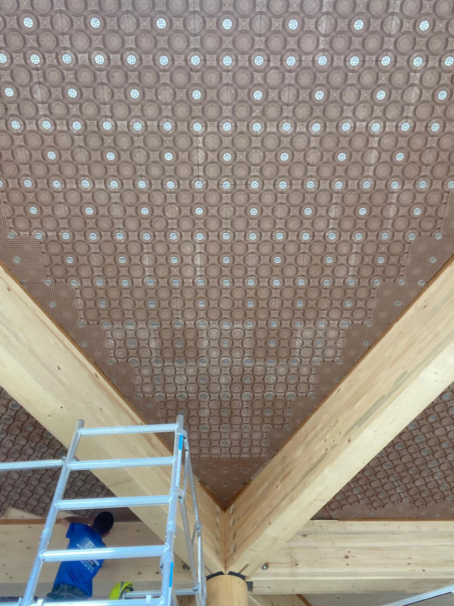 „Im Fall von Bever stellte uns die Deckenarchitektur allerdings vor besondere Aufgaben“, sagt Axel Lange, Geschäftsführer von Argillatherm. Denn für die Holzrippen-Konstruktion in Wabenform war mit den herkömmlichen quadratischen Modulen nichts anzufangen. „Wir haben deswegen alle Felder einzeln mit CAD geplant, um den Holzbau mit den nötigen Infos zu Aussparungen in den Balken zu versorgen.“ Tatsächlich gelang es so, alle Felder mit Humid-Modulen auszustatten sowie alle Rohrleitungen für die Heiz-Kühl-Funktion kupplungsfrei zu verlegen und an den Heizkreislauf anzuschließen.
