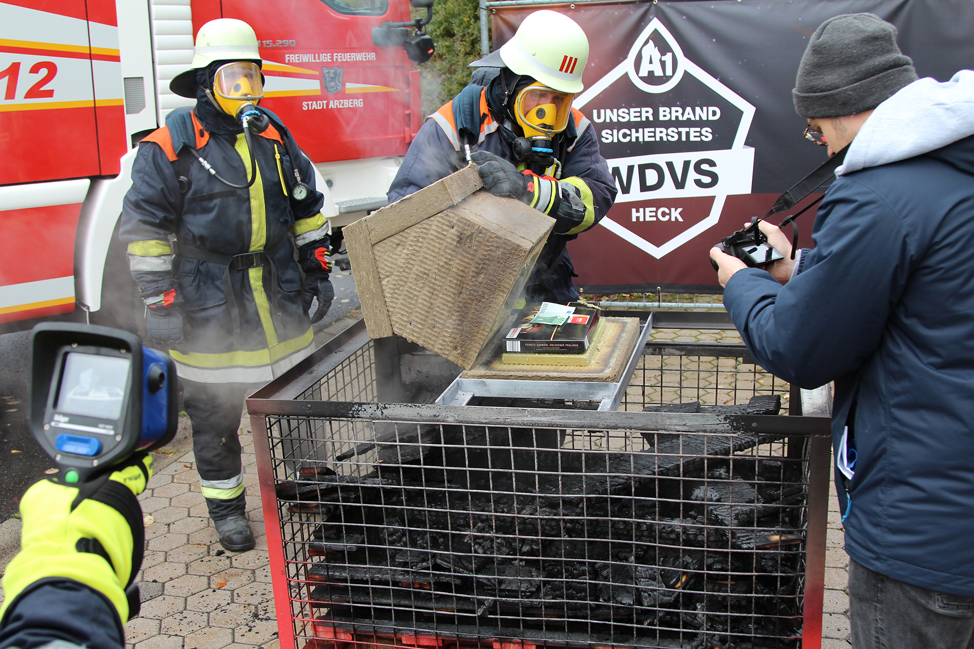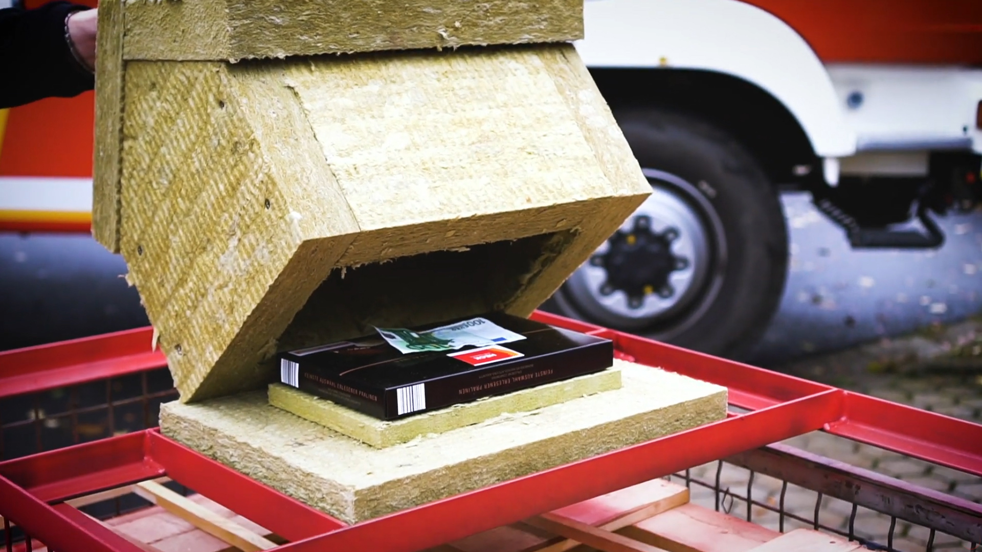 Können eine Schachtel Pralinen und ein 100-Euro-Schein im Feuer Temperaturen von annähernd 1000 Grad Celsius überstehen – nur von Steinwolle geschützt und das eine Viertelstunde lang? Das klingt wie ein Fall für „Wetten, dass?“ Und Heiko Faltenbacher, Marketingleiter bei Heck Wall Systems in Marktredwitz, würde keine Sekunde zögern, da anzutreten. Den Beweis liefert er mit einem Video: In ihm halten Pralinen, nur von Wärmedämm-Verbundplatten aus Steinwolle ummantelt, Hitze und Flammen stand, ohne auch nur ansatzweise zu zerlaufen. Wohlgemerkt: Der Schmelzpunkt von Schokolade beträgt 38 Grad Celsius.