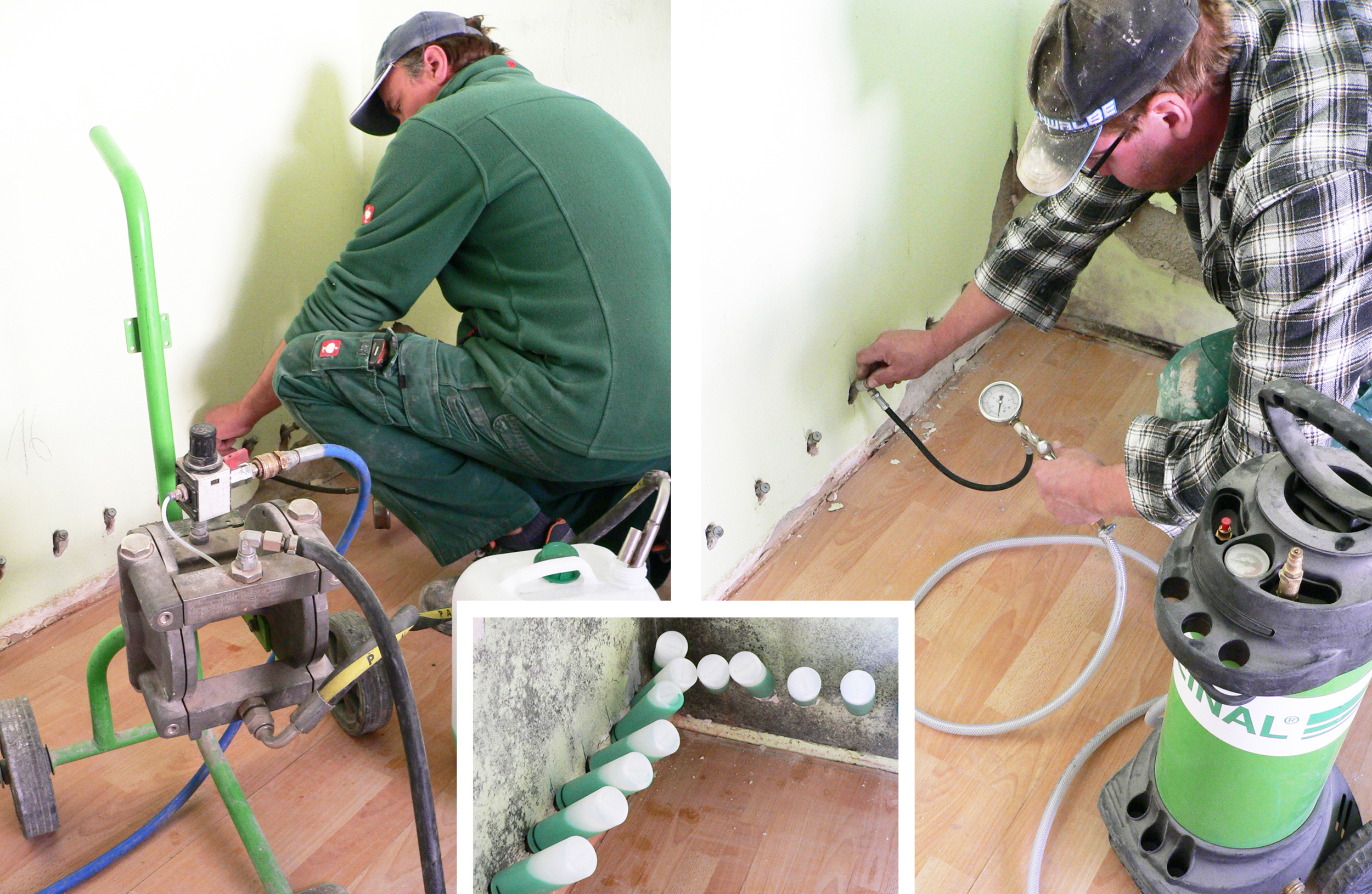 Nachträgliches Anbringen einer Horizontalsperre. Je nach Beschaffenheit des Mauerwerks wird die Veinal Silikonharz-Lösung mit Druck oder drucklos injiziert. (Bild: Veinal)