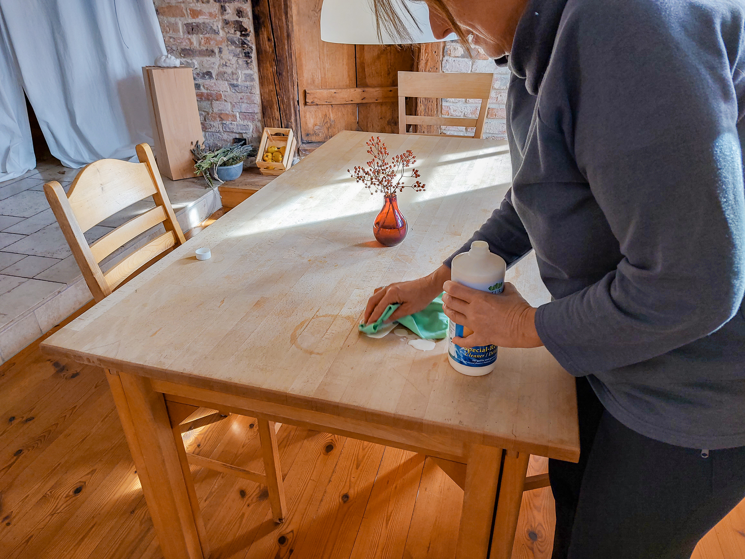 Die gereinigte Oberfläche hinterher mit einer schützenden und pflegenden Schicht versehen. Bei weniger strapazierten Möbeln genügt dazu ein Pflegewachsöl. Bei strapazierten Arbeitsplatten oder dem Esstisch empfiehlt sich ein spezielles Tec-Oil. Beide Produkte mit einem Schwamm satt auftragen. Was nicht einzieht, nach 20 Minuten mit einem fusselfreien Tuch wieder abnehmen.