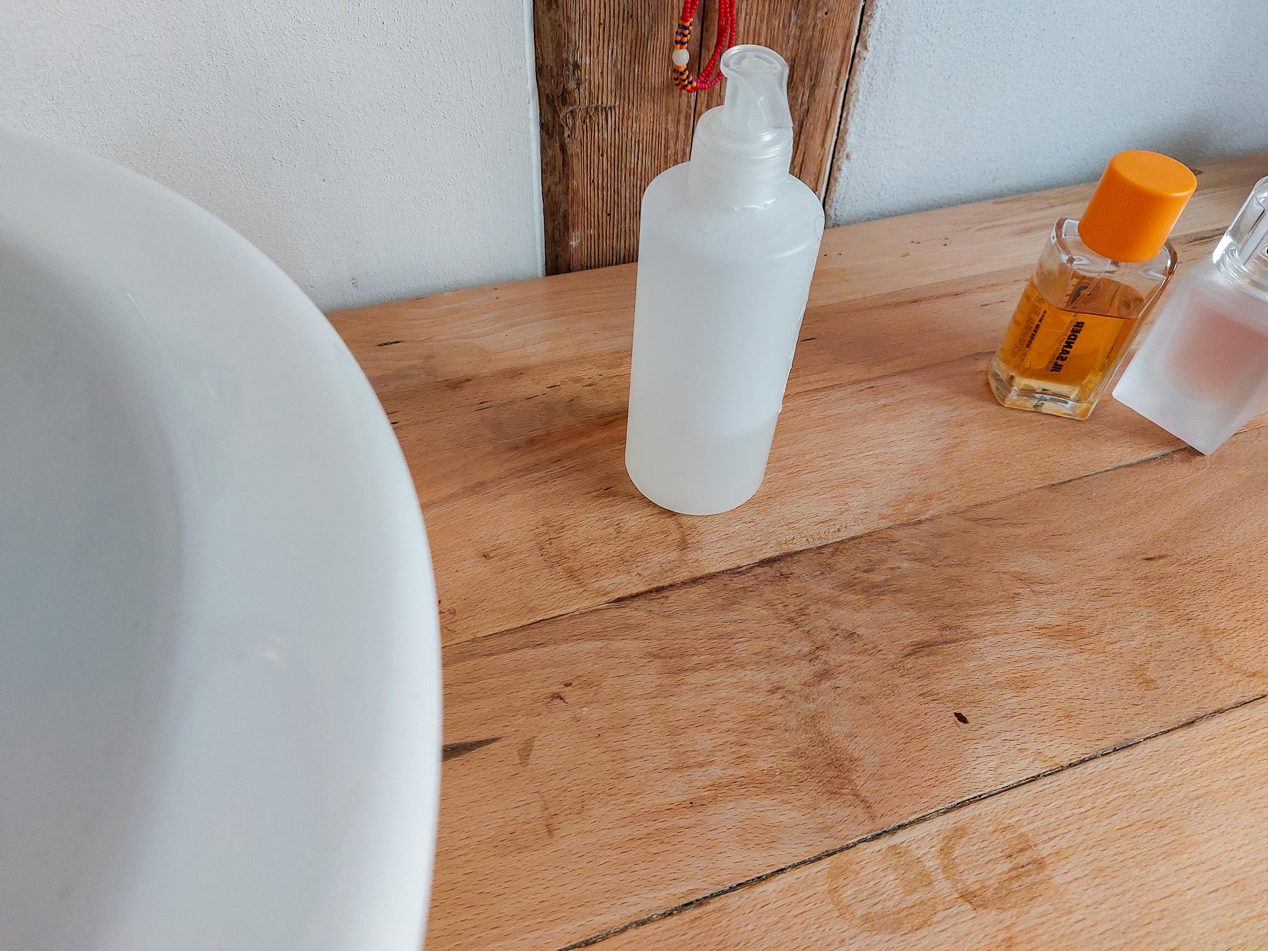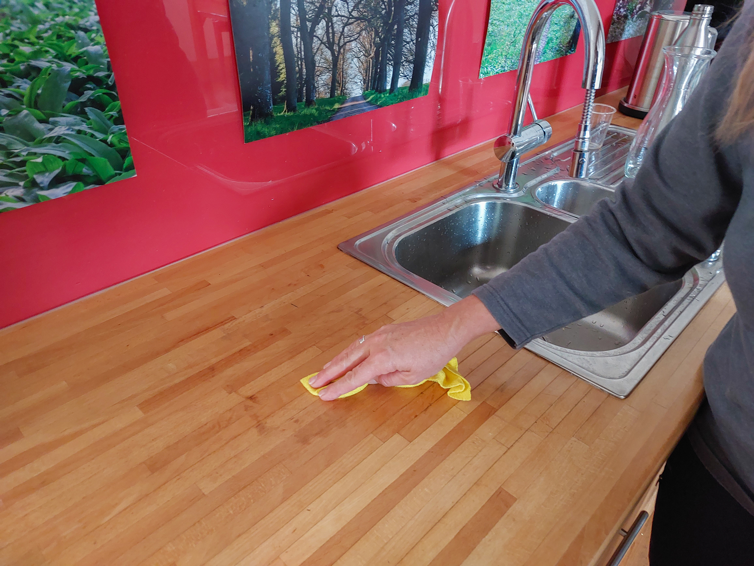 Um das Holz vor eindringender Feuchtigkeit von vornherein zu schützen, genügt es, die Oberflächen in Küche und Bad einmal jährlich mit Tec-Oil zu pflegen. Das wirkt wie eine Imprägnierung, so dass Flecken erst gar nicht entstehen. Wasserspritzer und Schmutzreste lassen sich dann einfach abwischen.