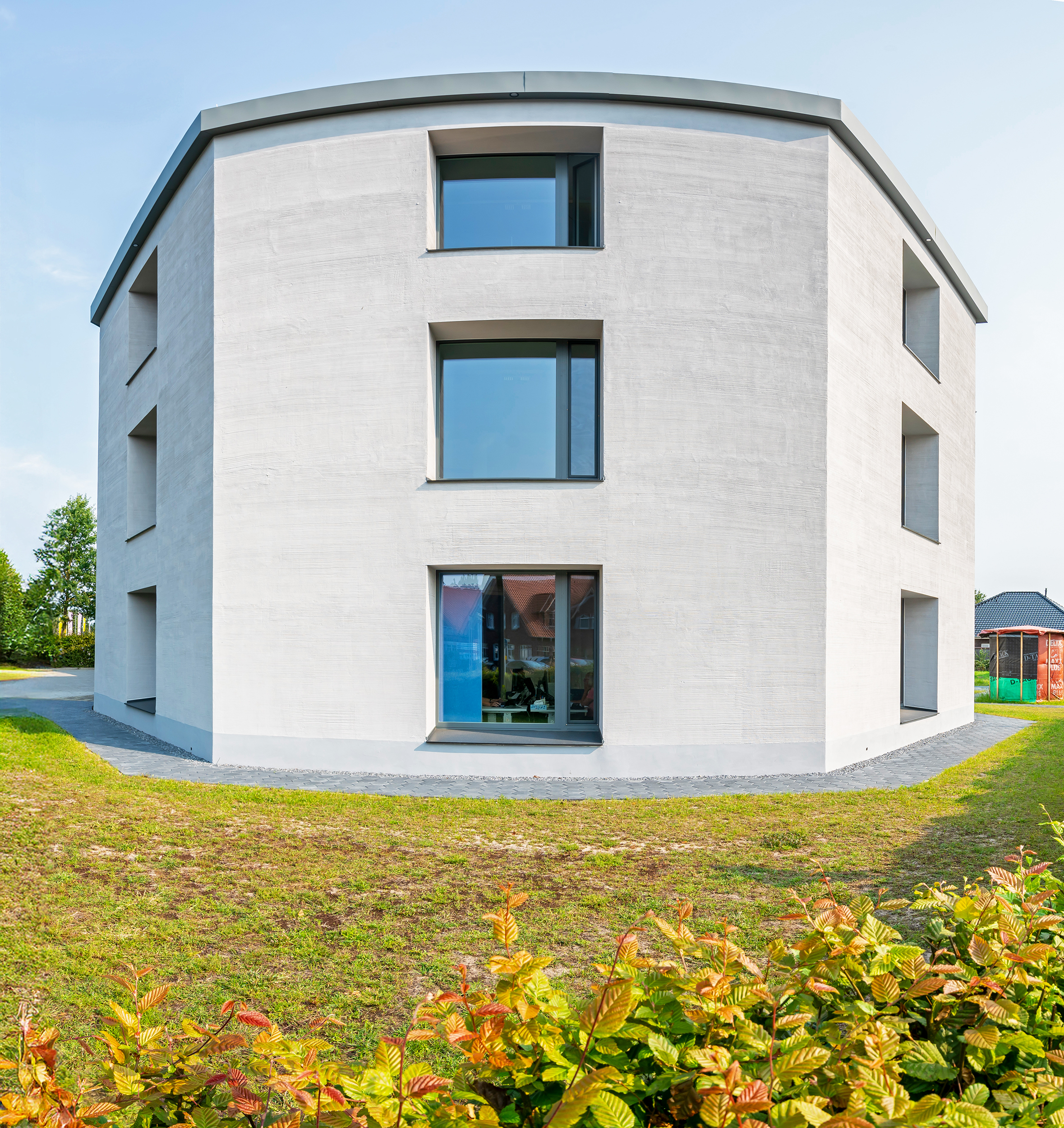Monolithische Außenwände und Naturkalk-Putz: Achteckiges Bürogebäude im niedersächsischen Garrel kommt ohne Heizung und Lüftungsanlage aus