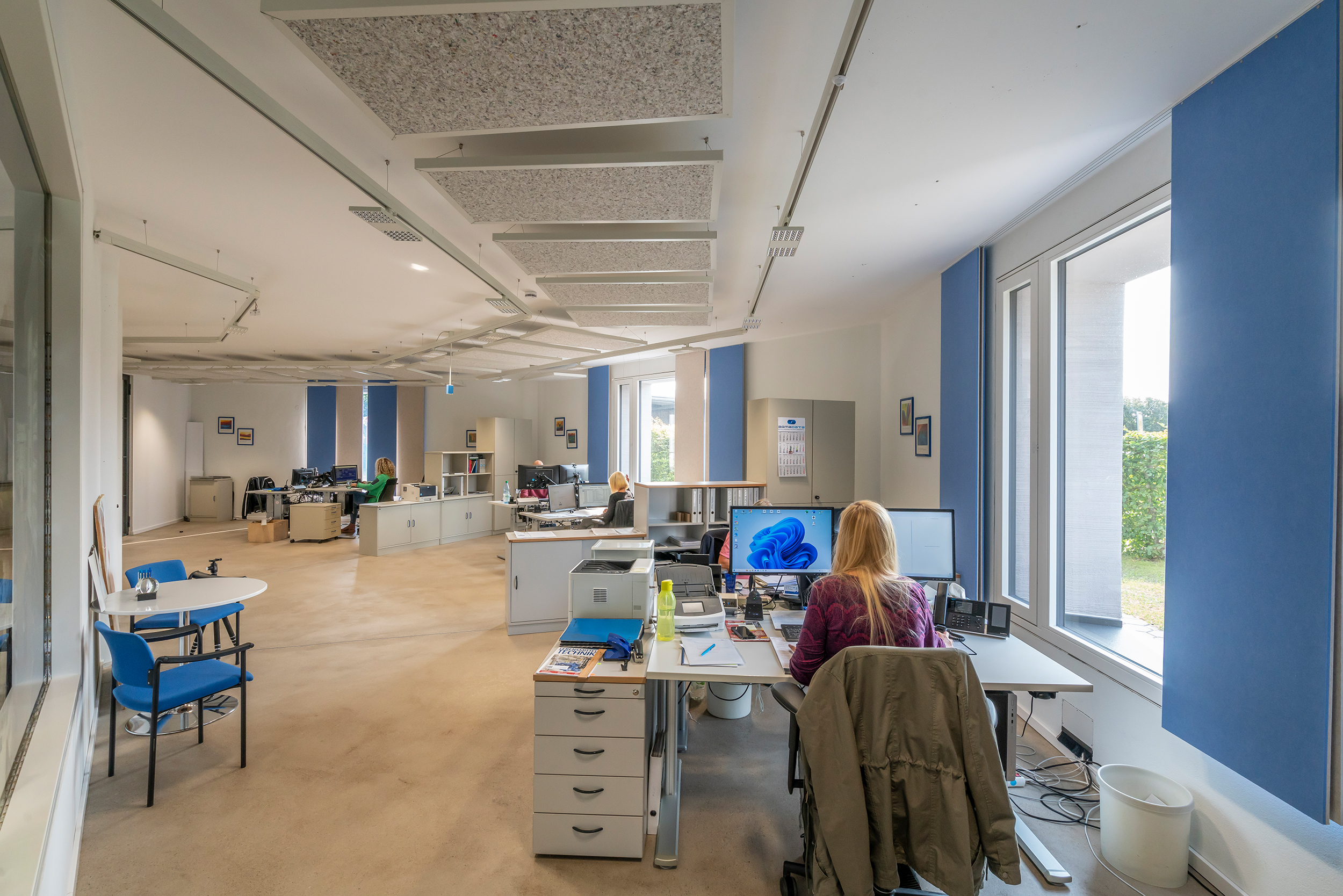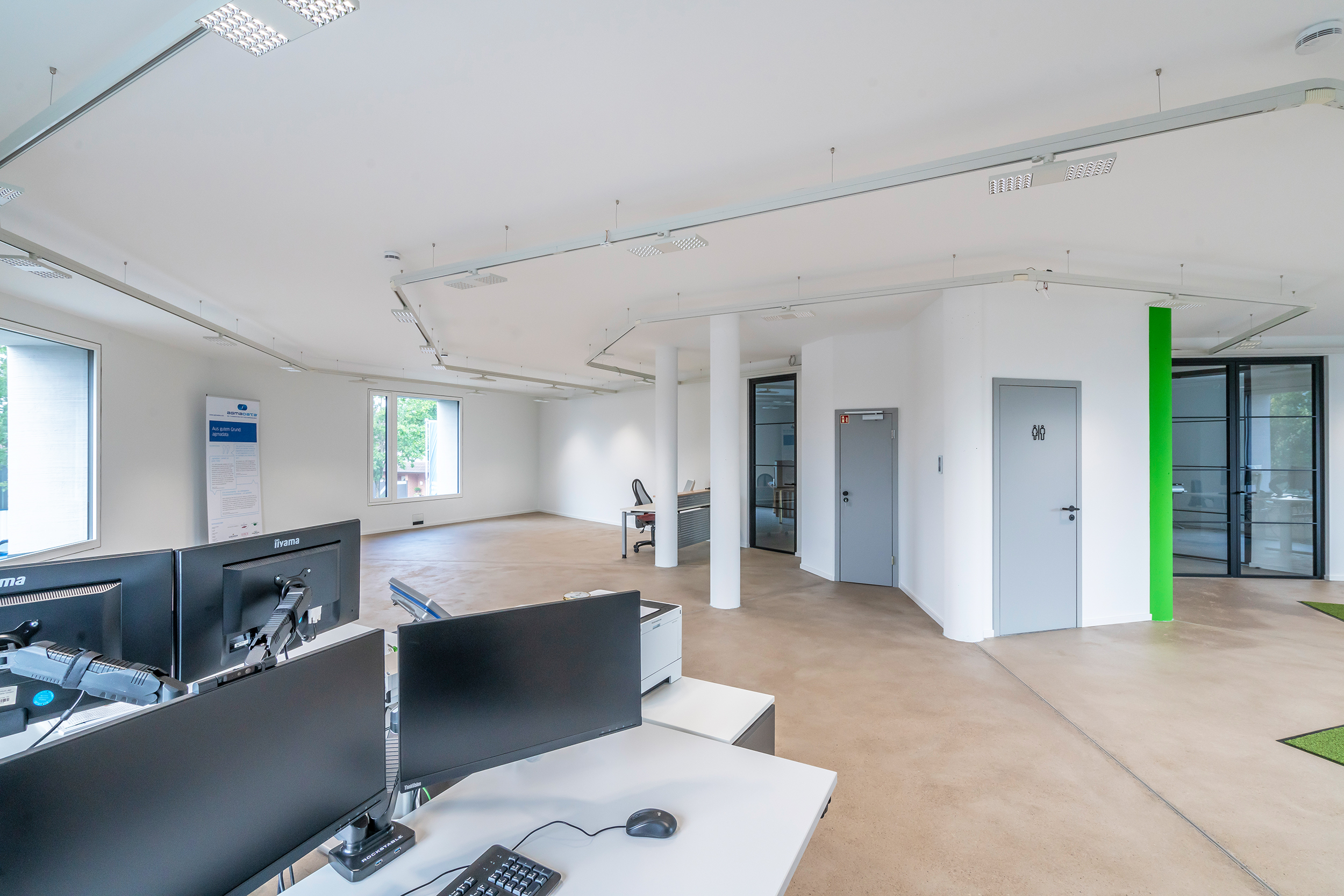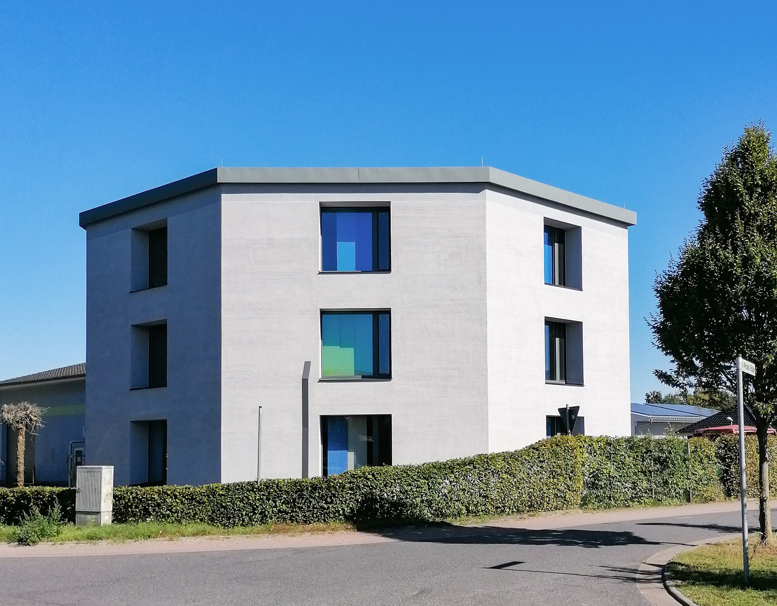 Das Gebäude ist der Sitz des IT-Unternehmens Agmadata. Der geschäftsführende Gesellschafter Helmut Vossmann realisierte hier seine Vision von nachhaltigem Bauen ohne teure Klimatechnik. „Es ist wohl das einzige Oktagon-Bürogebäude in monolithischer Bauweise in Deutschland“, vermutet er. Mit dicken Außenwänden und Naturkalkputz gelingt ein optimales Raumklima.