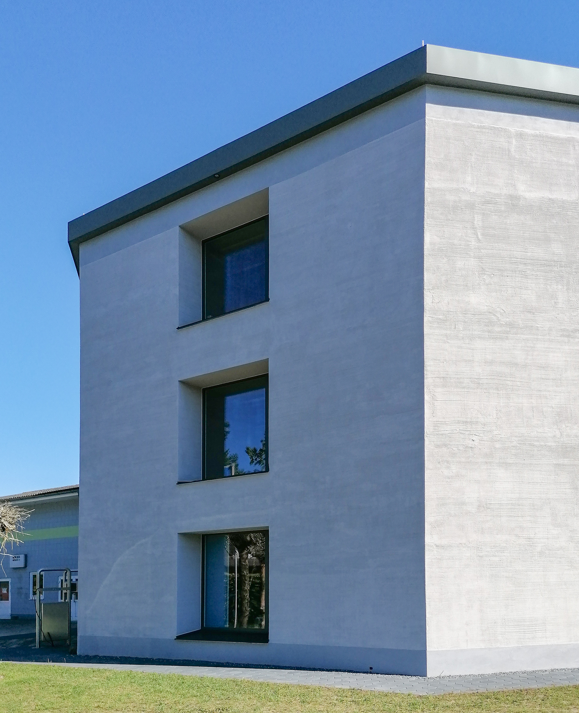 Für die Fassade wurden Naturkalk-Produkte des Schweizer Herstellers HAGA verwendet: Bio-Grundputz, Bio-Einbettmörtel und Hagasit Bio-Edelputz mit horizontaler Besenstruktur und einem Anstrich mit Silikatfarbe. Der Vorteil von Naturkalk im Außenbereich: Er nimmt bei Regen Feuchtigkeit auf und gibt sie schnell wieder ab. Die Fassade ist so nie wirklich nass, Schmutz haftet kaum an, Algen wird die Wachstumsgrundlage entzogen.