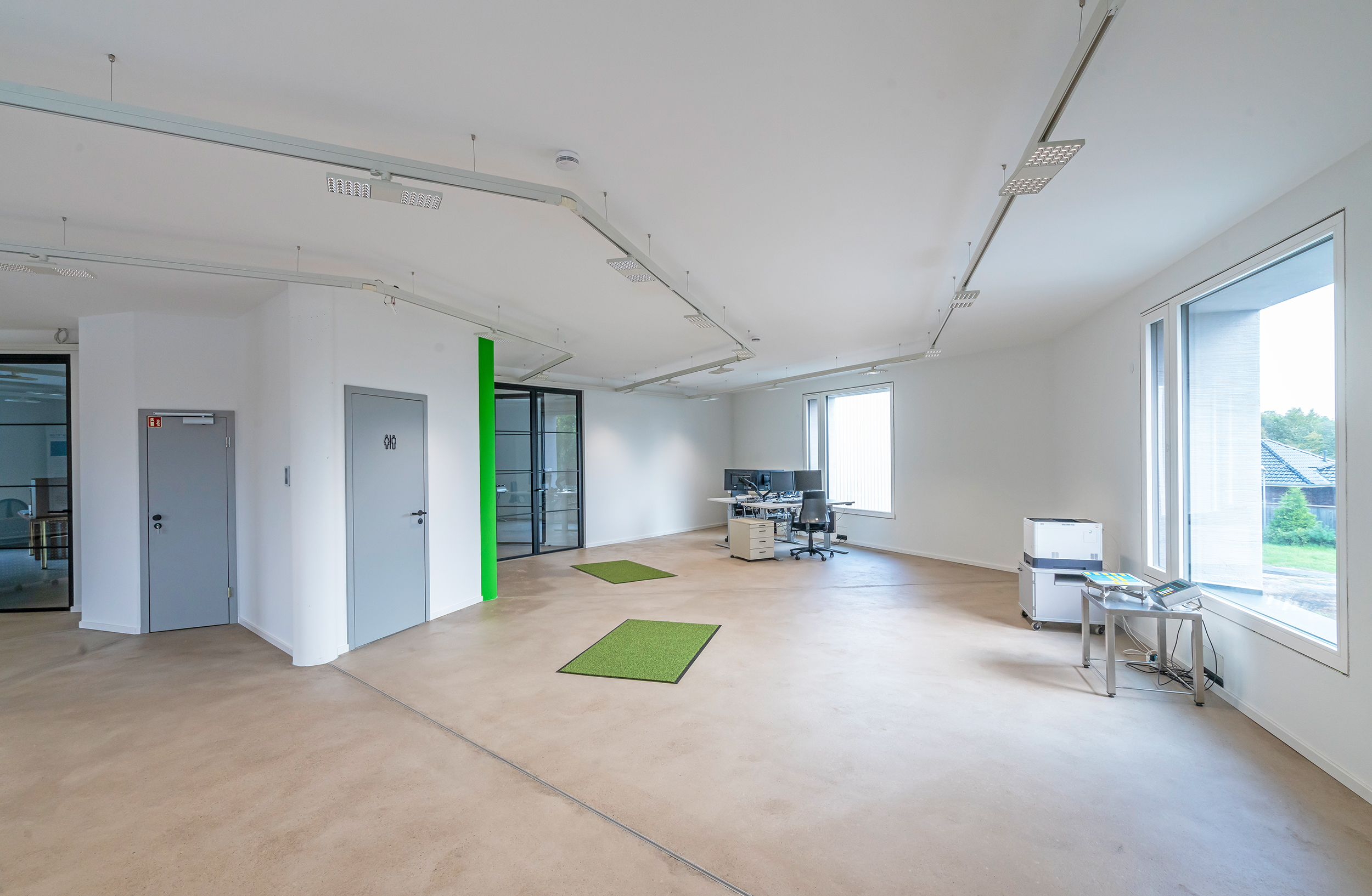 Zum Nachhaltigkeitskonzept gehört auch die Toilettenspülung mit Regenwasser. Dieses Brauchwasser könnte bei Bedarf auch zur Kühlung durch die Leitungen fließen. „Wir mussten aber noch nie kühlen“, sagt Vossmann. Im Sommer verschatten zudem die 75 Zentimeter tiefen Fensterlaibungen das Innere. Für die Akustik sorgt eine Decke aus verpresster Cellulose. Am Boden wurde statt Linoleum ein Sichtestrich gewählt, um Verschnitt in den 45°-Winkeln des Oktagons zu vermeiden.
