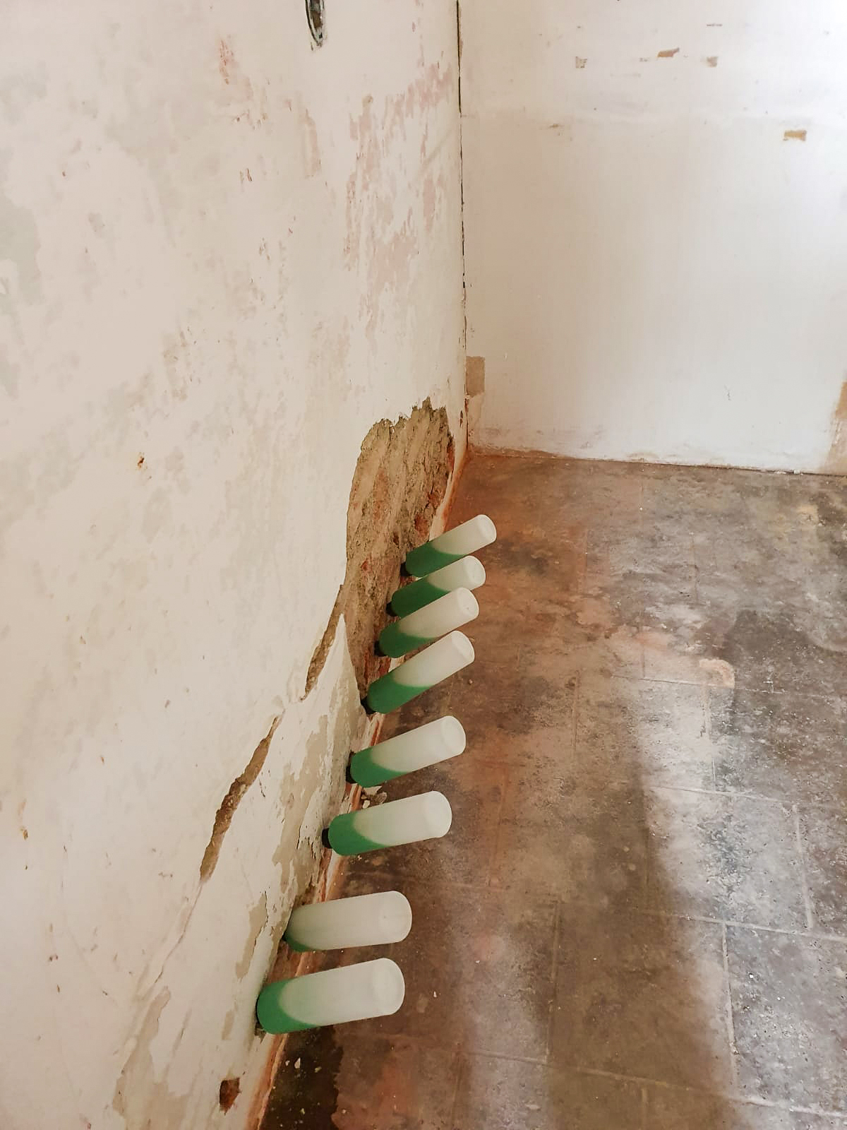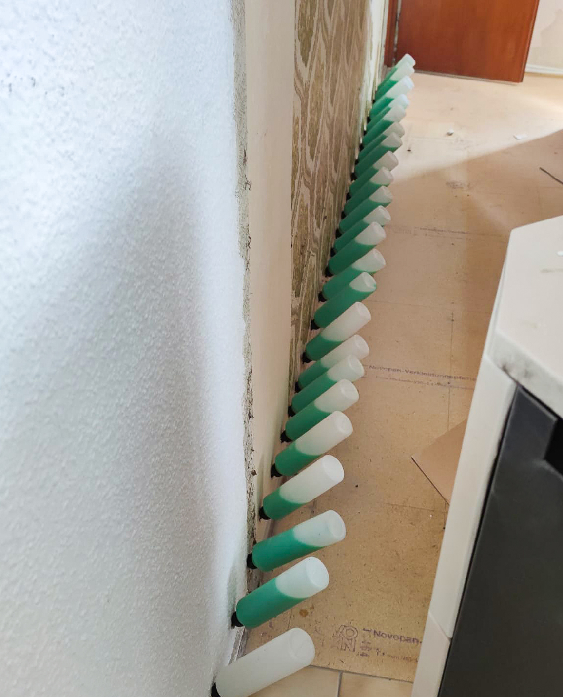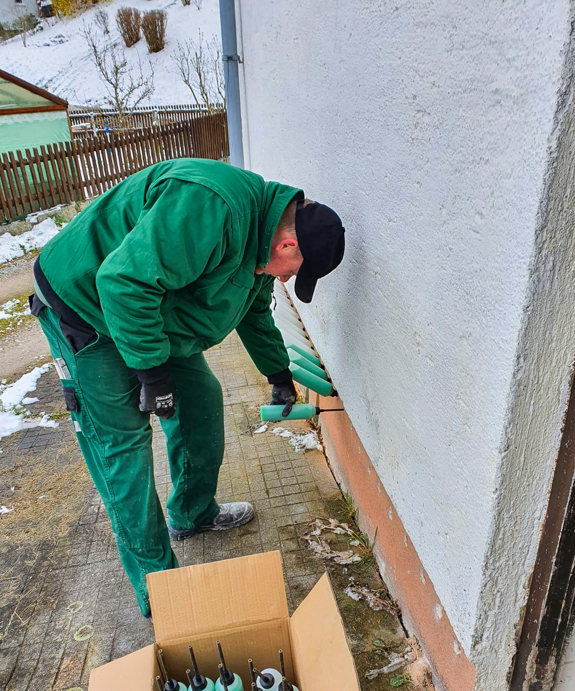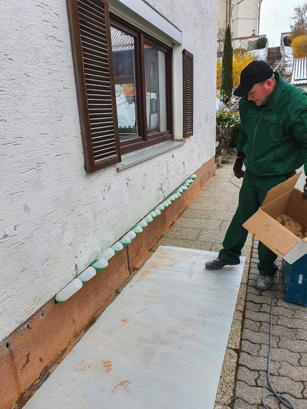 Abhilfe schafften nachträglich per Injektion eingezogene Horizontalsperren, die verhindern, dass kapillare Feuchtigkeit im Mauerwerk von unten aufsteigt. Schuster hat dazu mit VEINAL® VSS 1-90 ein markenrechtlich geschütztes Verfahren entwickelt. Dazu werden in der Mauer oberhalb des Bodens Bohrlöcher in einer Linie eng nebeneinander platziert. In die Kanäle wird eine spezielle Silikonharzlösung injiziert. Das Harz kleidet jede Pore des Baustoffs aus härtet aus und bildet eine für Feuchtigkeit undurchlässige Schicht. So können die oberen Abschnitte der Wand austrocknen und die Wandbereiche bleiben trocken.