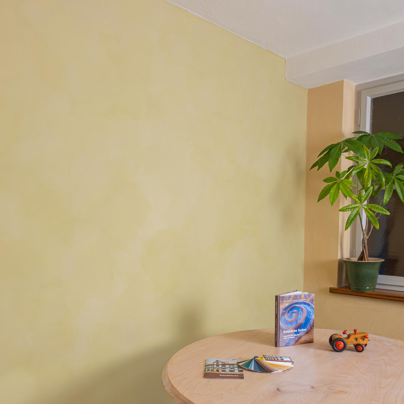Die lebhaften Übergänge zwischen deckenden und transparenten Bereichen lassen die Wand je nach Lichteinfall und Blickwinkel anders wirken. (Bild: Kreidezeit Naturfarben)