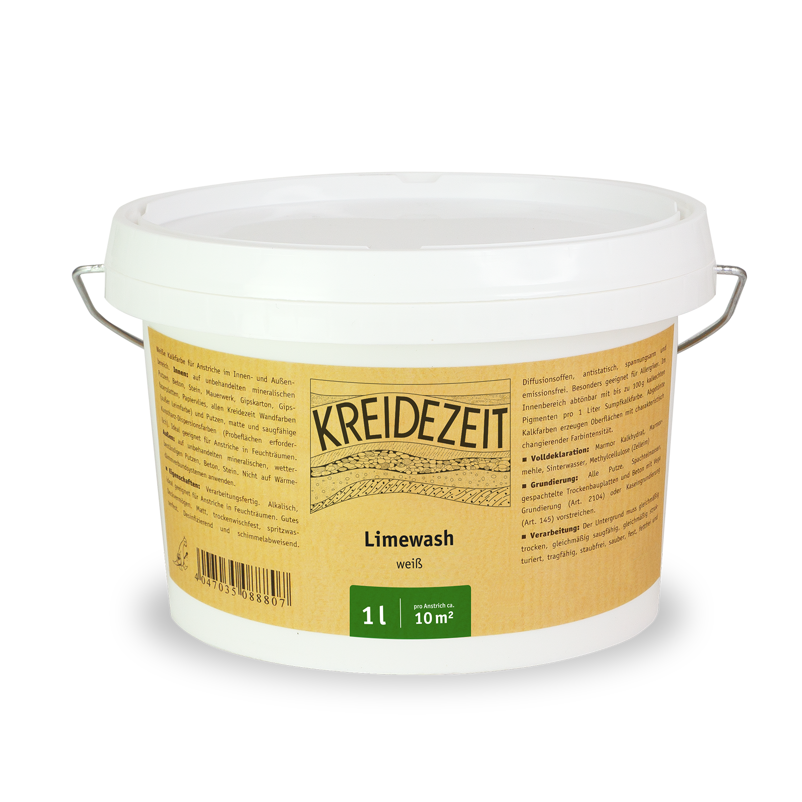 Kreidezeit Limewash besteht aus hochwertigem, mehrjährig gelagertem Sumpfkalk – ohne versteckte Zusätze. Der gebrauchsfertige Anstrich ist diffusionsoffen und durch seine Alkalität stark schimmelhemmend. Er enthält im Gegensatz zu klassischen Kalkfarben weder Marmormehl noch Weißpigment, das macht ihn dünnflüssig und leicht transparent. Dank der freiwilligen Volldeklaration lässt sich die Zusammensetzung lückenlos nachvollziehen.
