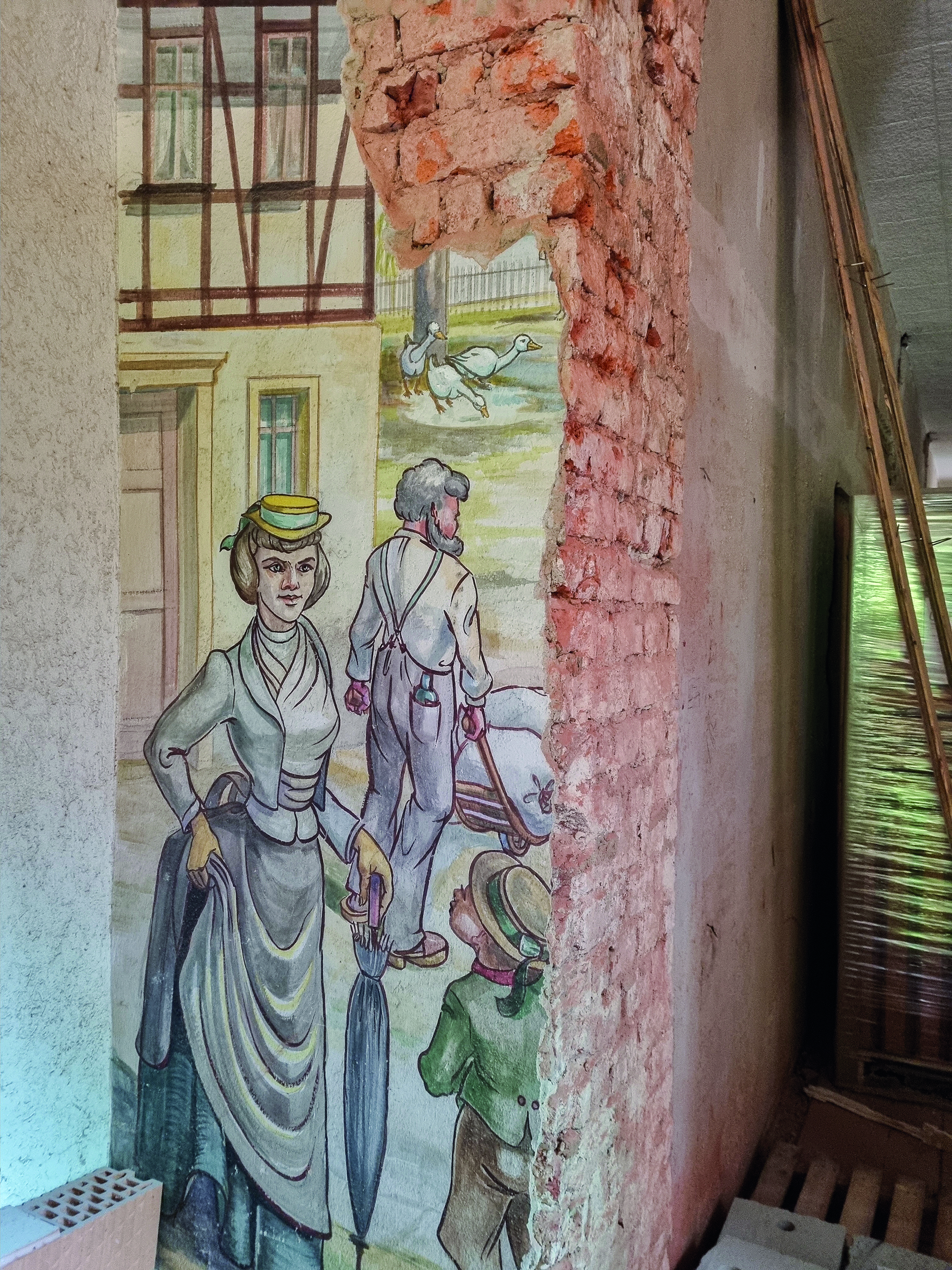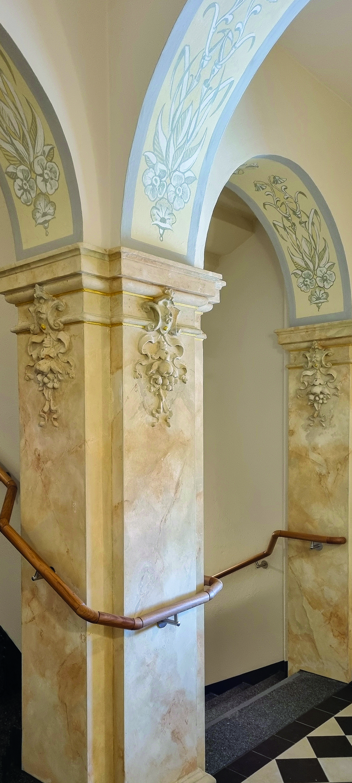 Die Wandbemalungen im historischen Foyer wurden teils freigelegt, teils rekonstruiert. Und so schimmert im Haus Waldquell noch viel vom Glanz der Belle Epoche durch. Ursprünglich wurde das von einem parkähnlichen Garten umgebene Haus als Sanatorium genutzt, später war dort ein Altenpflegeheim untergebracht, ab 1992 stand das Gebäude leer. Heute können Bewohner in dem Haus im Chaletstil das historische Ambiente mit modernem Innenleben genießen.