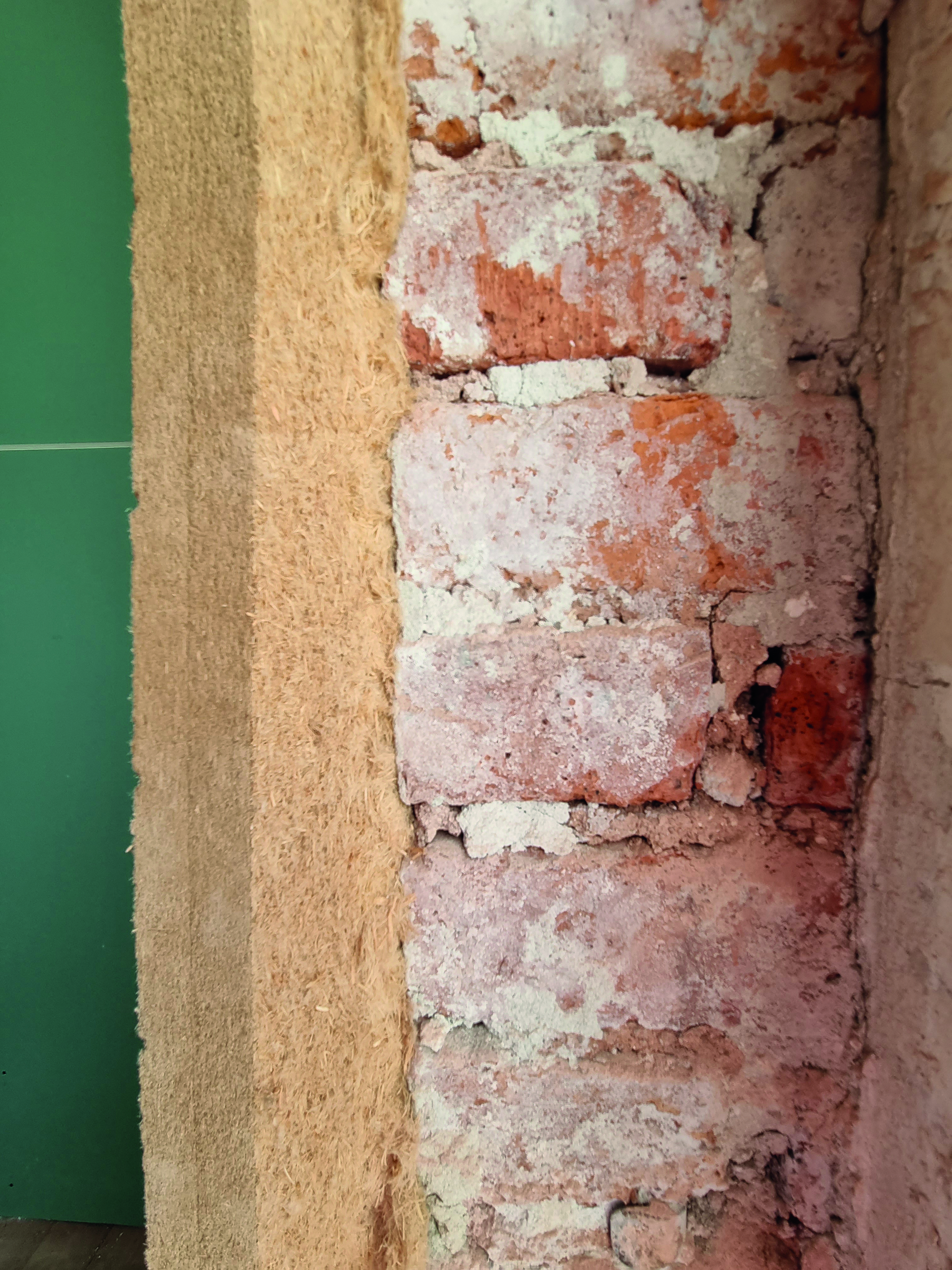 Im Haus Waldquell wurden die Außenwände deswegen auf einer Fläche von 1.300 Quadratmetern mit der Holzfaser-Innendämmung Udi IN Reco versehen. Die biegsamen schmiegen sich mit ihrer weichen Seite an die Mauer und gleichen so Unebenheiten bis zu zwei Zentimetern aus. Daher musste an der Innenseite lediglich der schadhafte Putz des Ziegelmauerwerks abgeschlagen werden, alle unversehrten Flächen ließen sich einfach überdämmen.