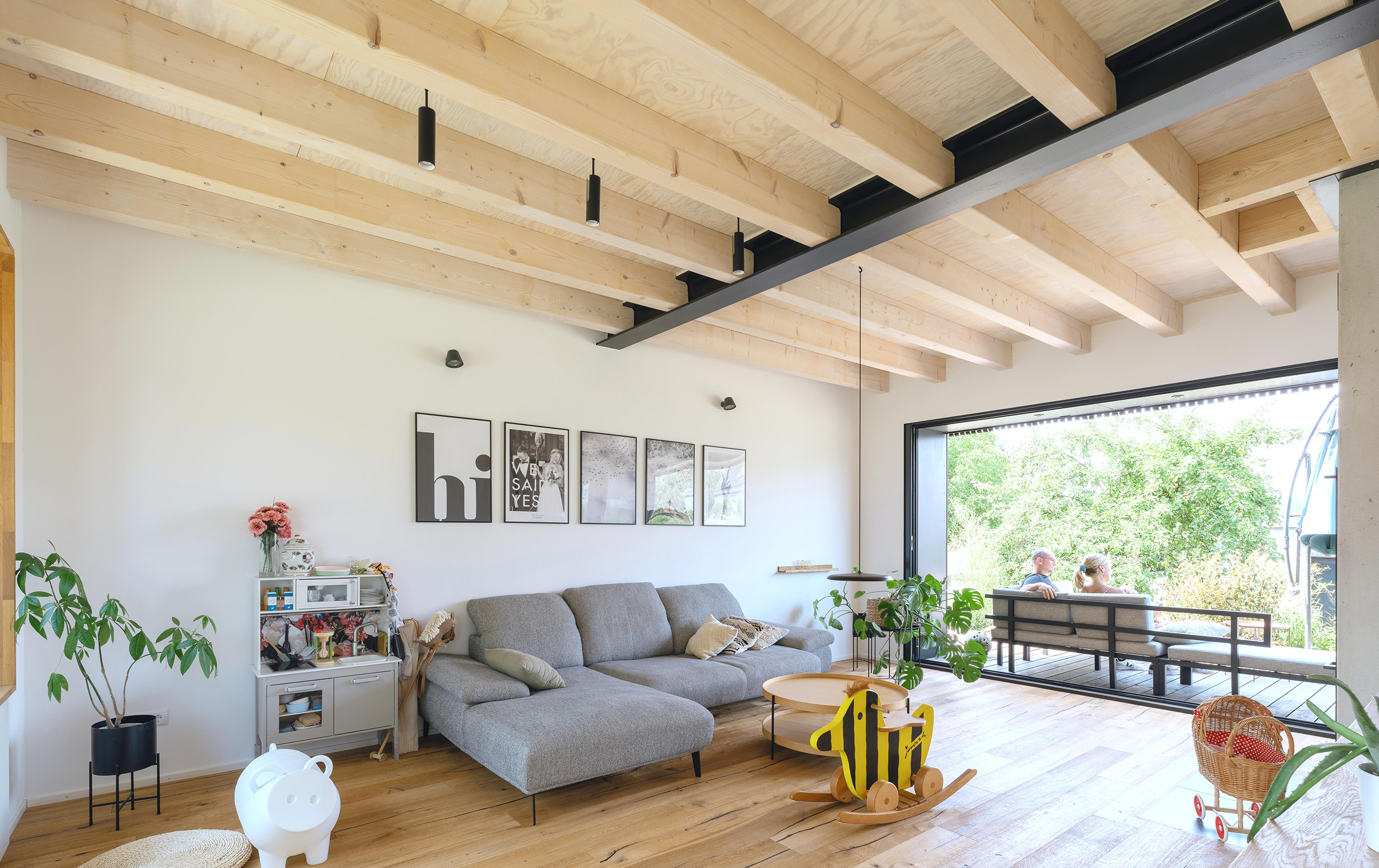 Die „Verdunklungsgefahr“ liegt in der Natur der Sache. „Das Lignin in den oberen Holzschichten baut sich durch die UV-Strahlung im Laufe der Zeit ab, das Holz wird dunkler. Besonders die häufig verwendeten Holzarten Kiefer oder Tanne“, erklärt Werner Koppermüller, technischer Berater beim Naturfarbenhersteller Natural. Wer sich daran stört, dem empfiehlt er eine Deckenbehandlung mit Bienenwachsbalsam in Zartweiß oder – für stärker nachgedunkelte Oberflächen – einem besser deckenden Altweiß. Der natürliche, auf Wasserbasis und ohne Lösemittel hergestellte Anstrich ist nahezu geruchsneutral. Der Wachsanteil verleiht dem Holz eine samtige Oberfläche.