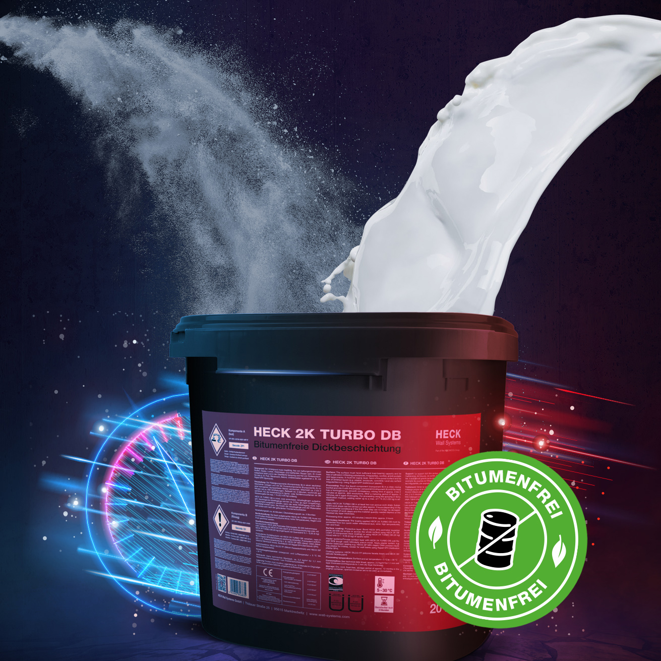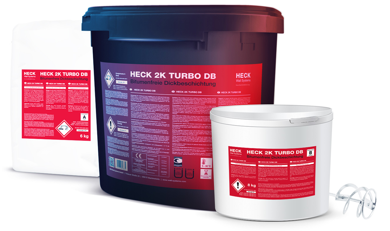 Neben den klassischen Aufgaben Abdichtung und Feuchteschutz dient HECK 2K TURBO DB auch als Ausgleichs- bzw. Egalisierungsmörtel. Vertiefungen bis 5 Millimeter können dadurch vor dem Aufbringen der Dickbeschichtung ausgeglichen werden. Darüber eignet sich das Produkt auch zum Verkleben der Sockel- bzw. Perimeter-Dämmplatten. Letzteres funktioniert auch auf vorhandenen Bitumen-Untergründen. HECK 2K TURBO DB ist sowohl per Hand wie auch maschinell zu verarbeiten. Es ist überstreich- und überputzbar.
