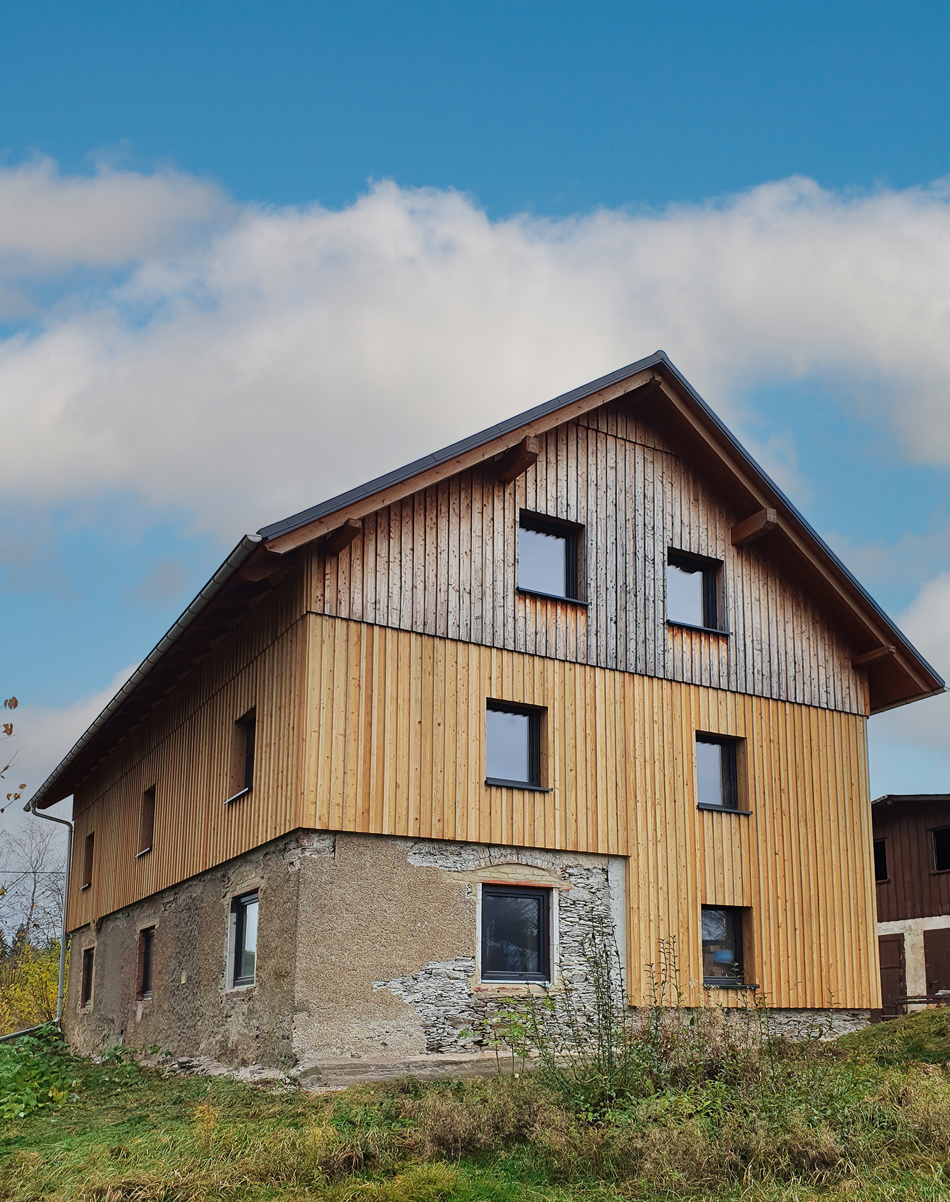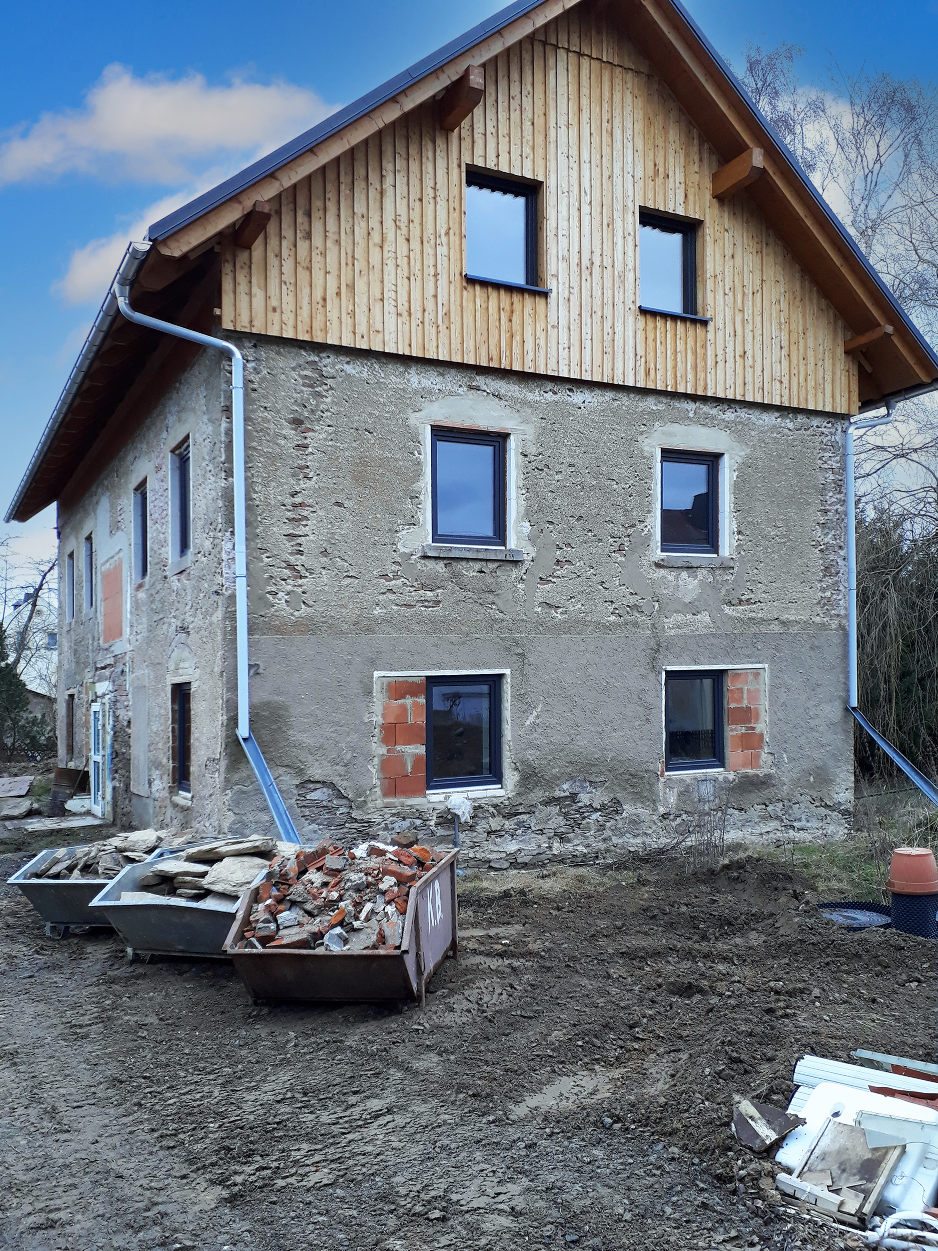 Am Ende standen nur noch die Außenmauern im Erd- und Obergeschoß: Das Wohnhaus aus dem Jahr 1890 war komplett entkernt worden. An die Bruchstein-Mauer schloss sich oben ein zweischaliges Ziegelmauerwerk an, das Dachgeschoss wurde in Holzständerbauweise komplett neu errichtet.