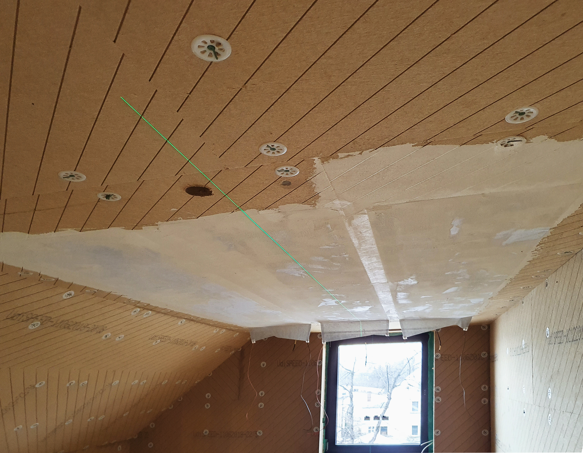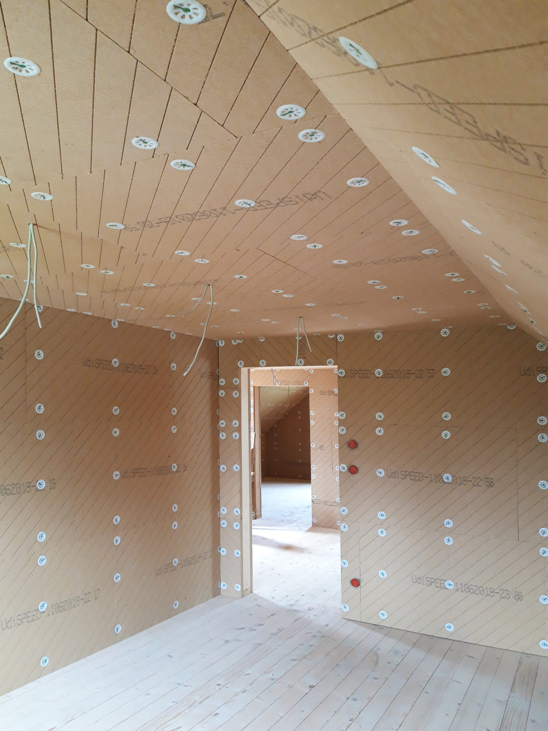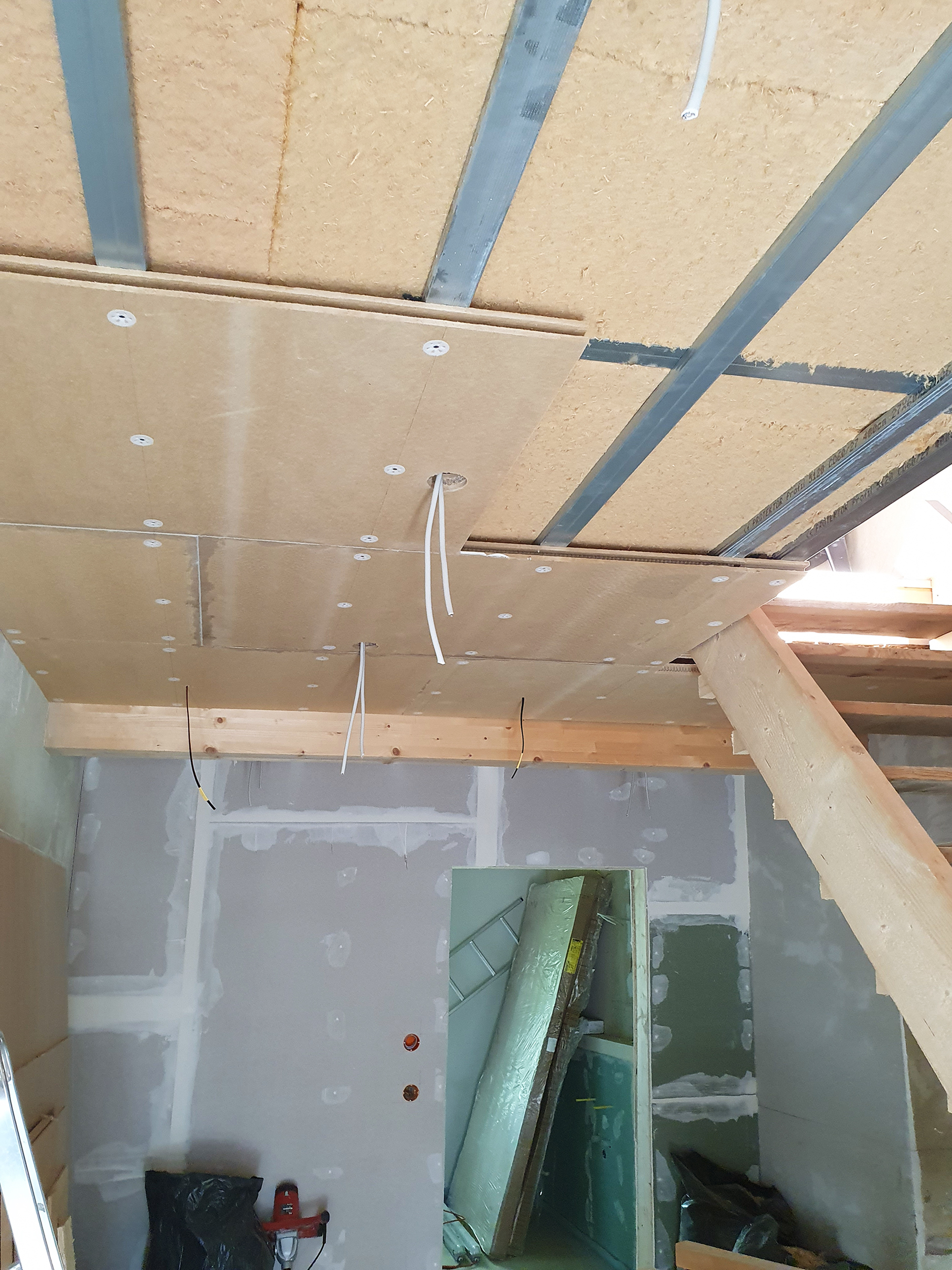 Als Dämmung fungiert eine Holzfaser-Ausbauplatte (UdiClimate), die auch die Luftfeuchtigkeit im Raum reguliert. Durch Klimakammern – integrierte Kartonwaben, die eine Art Luftpolster bilden – wirkt die Dämmung wie ein Wärmespeicher. Dank dieses Dämmplatten-Aufbaus werden Lärm und Trittschall um mehr als die Hälfte gedämpft.