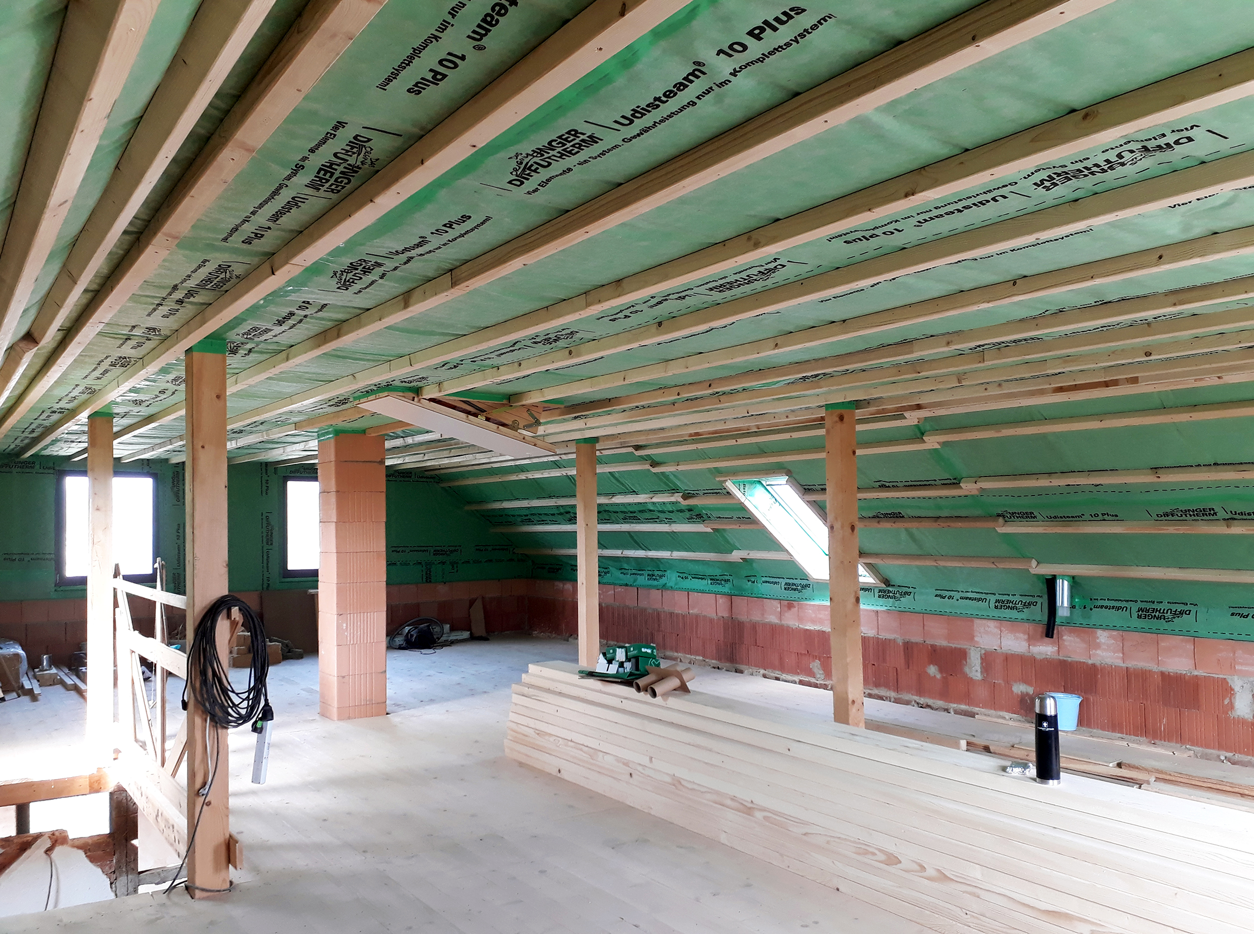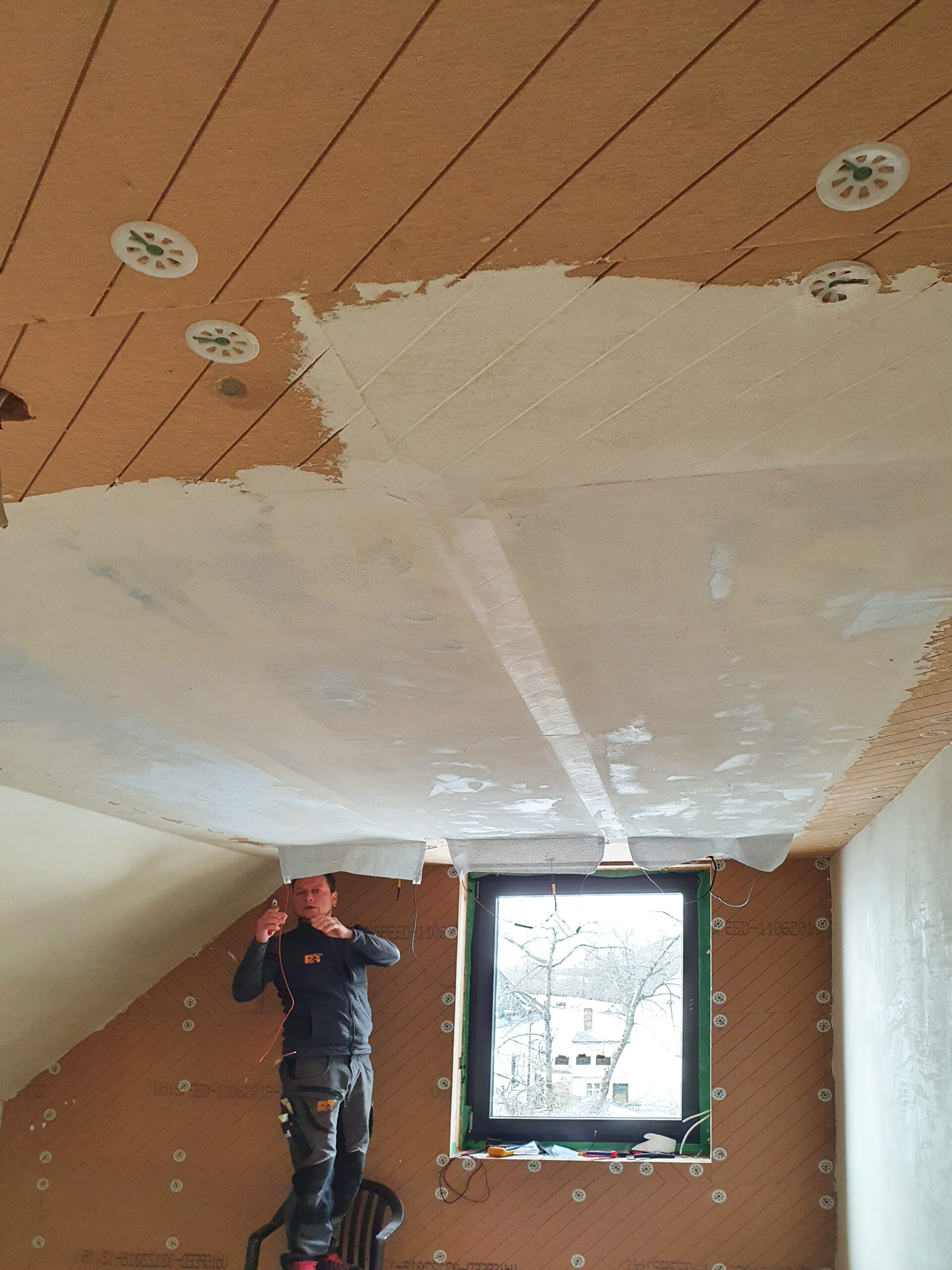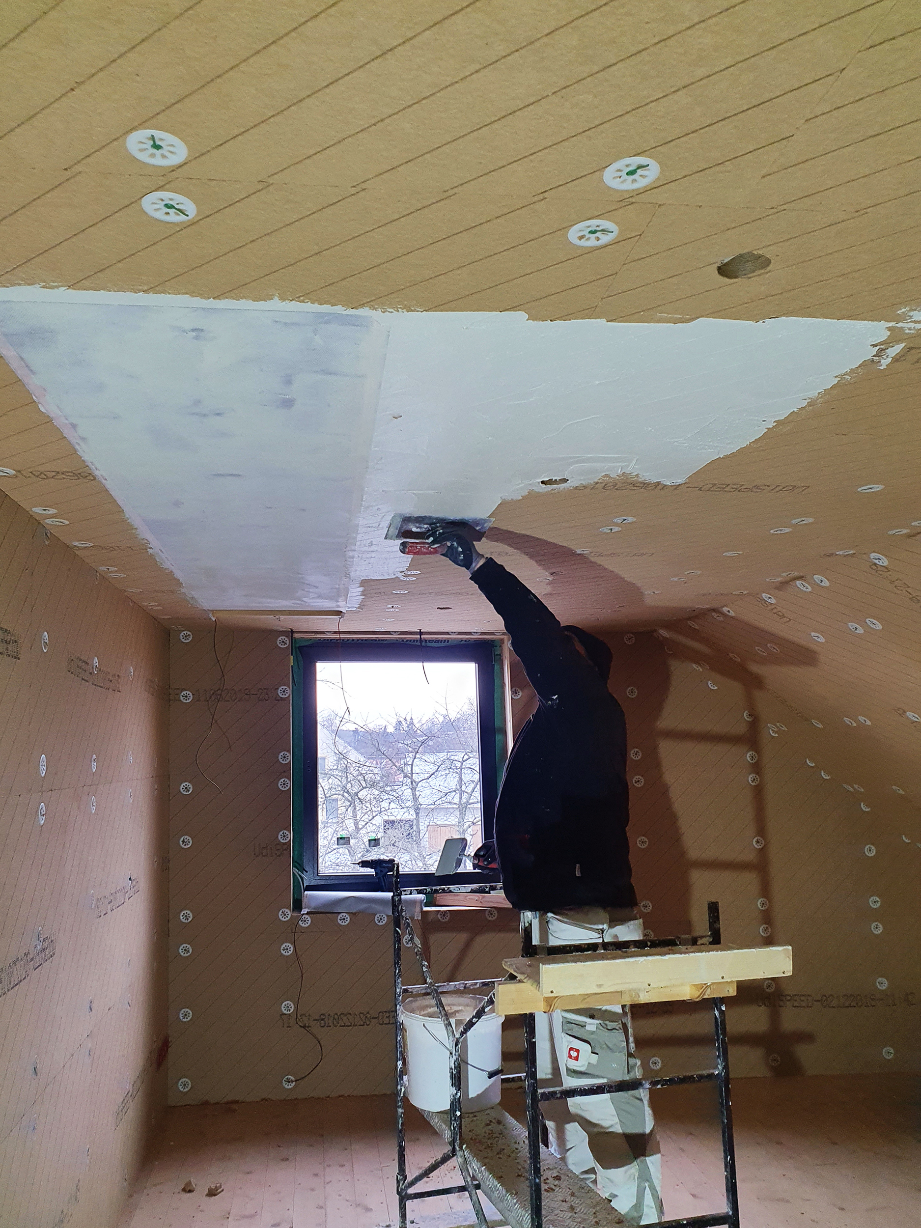 Bei den Außenwänden variiert der Aufbau der Dämmung je nachdem, ob es sich um Bruchstein, Ziegelmauerwerk oder Holzbauweise handelt. Fester Bestandteil ist jedoch immer die feuchtevariable Dampfbremse (UdiSteam) in Verbindung mit einer verputzbaren Trägerplatte (UdiSpeed) und einer Grundspachtelung samt Silikatfarbe. Die Dämmung ist damit überall im Haus diffusionsoffen und feuchteregulierend.