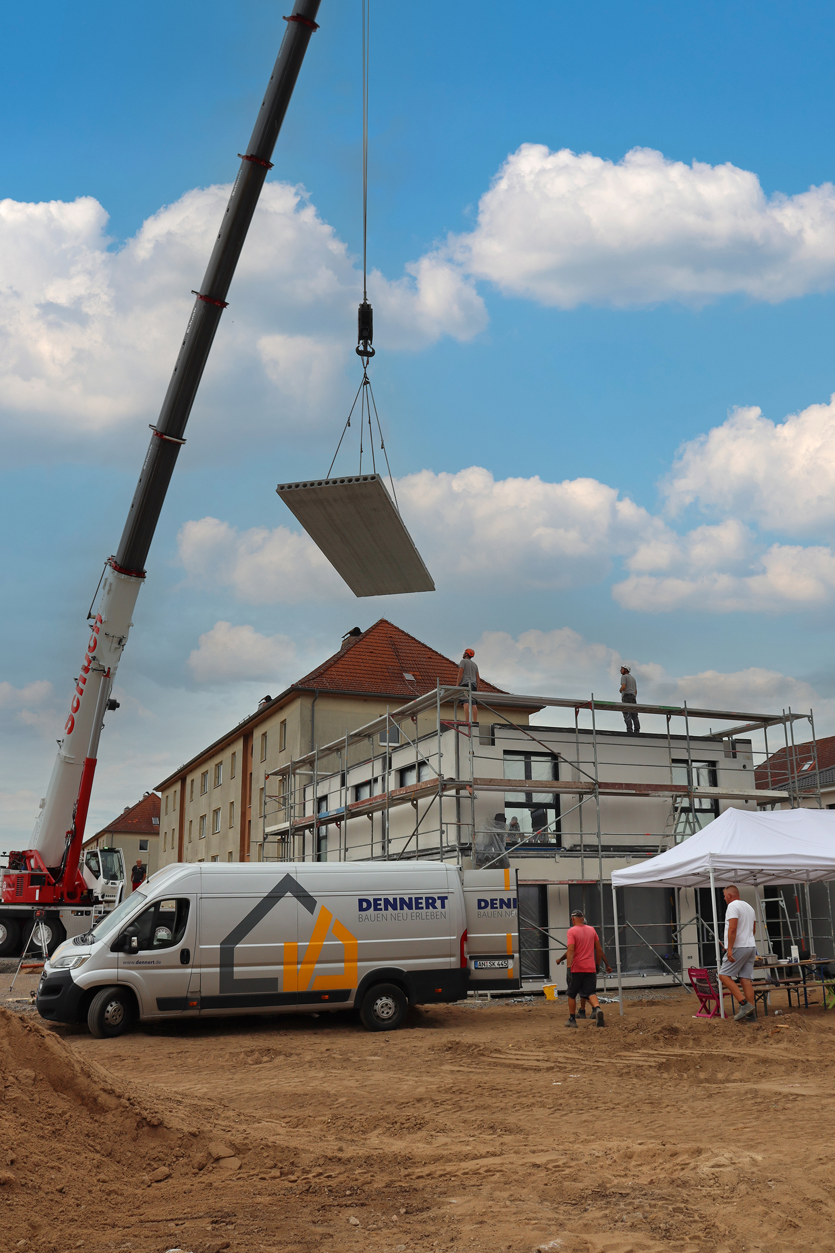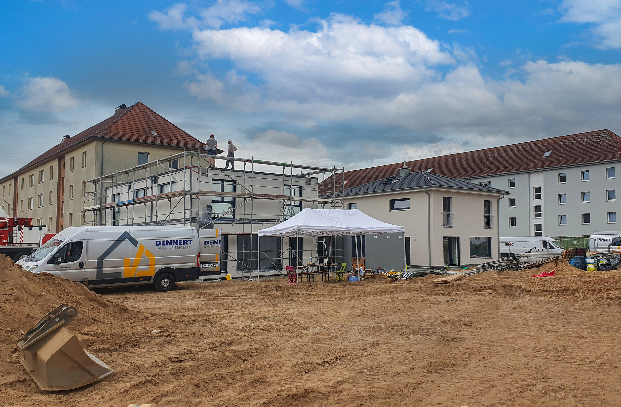 Die zehn Grundstückseigentümer hatten sich zusammengetan und einen Partner gefunden, der den Bau der Einfamilienhäuser zum Festpreis garantierte. „Während die Einzelhäuser schon fertig waren, hatten die anderen Unternehmen drumherum gerade einmal mit dem Rohbau begonnen, wenn überhaupt“, sagt Holger Kühne, Prokurist der Dennert Massivhaus GmbH. Denn in den „Kaisergärten“ konnte der Massivfertighaus-Hersteller seine Trümpfe gegenüber der konventionellen Bauweise voll ausspielen. Ein entscheidender Vorteil ist die Serienvorfertigung der einzelnen Raummodule im Werk. Sie werden auf der Baustelle innerhalb von ein bis zwei Tagen von speziell geschulten Teams montiert, was die Bauzeit enorm verkürzt und die Projekte wetterunabhängig und terminsicher macht.