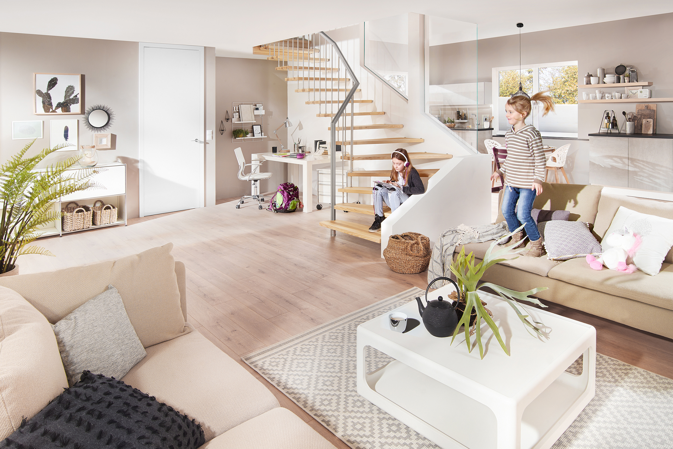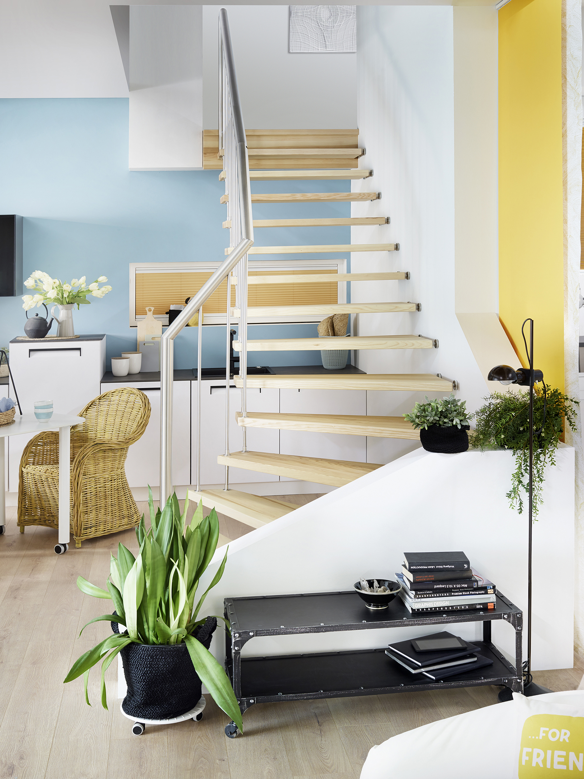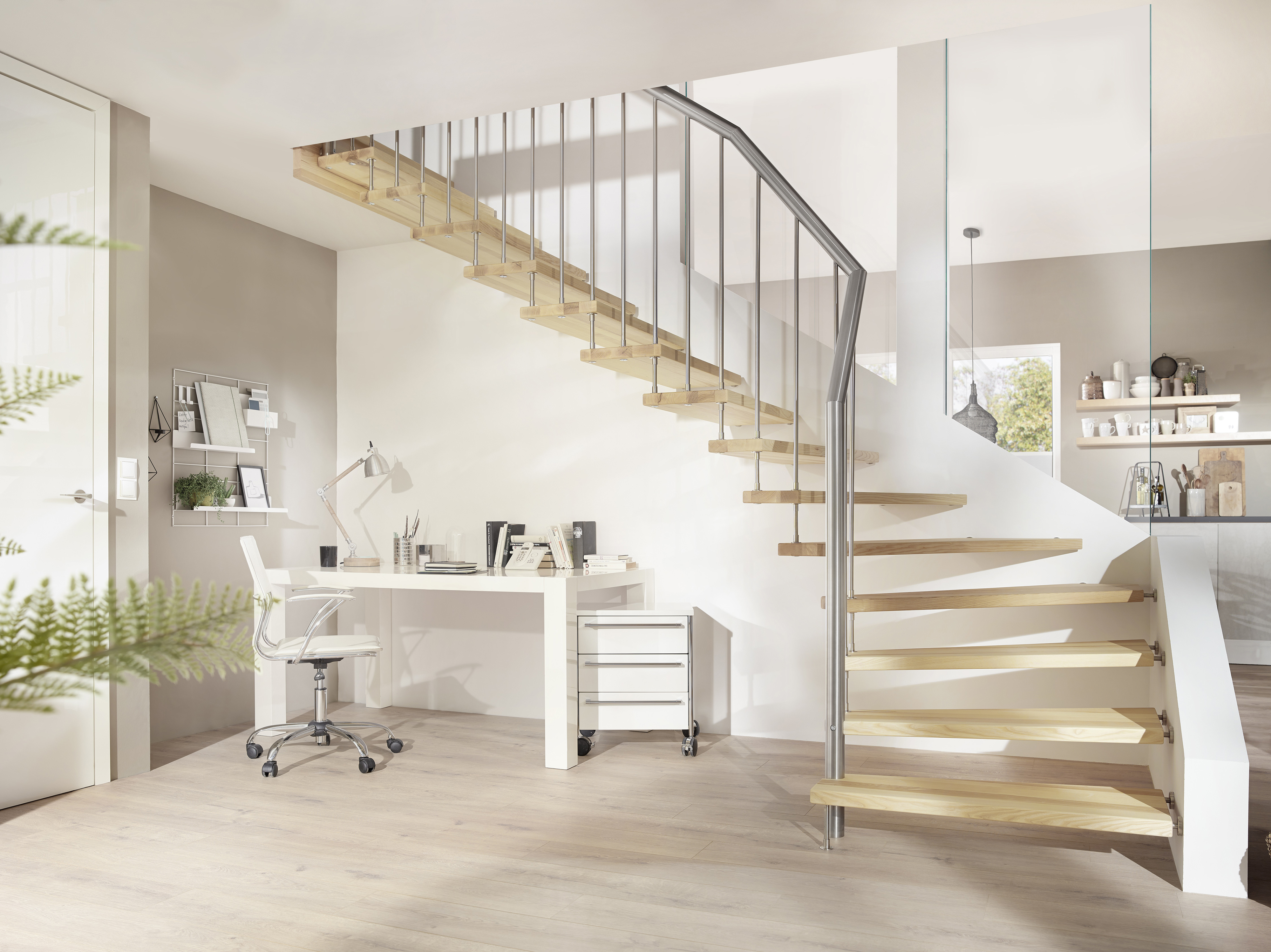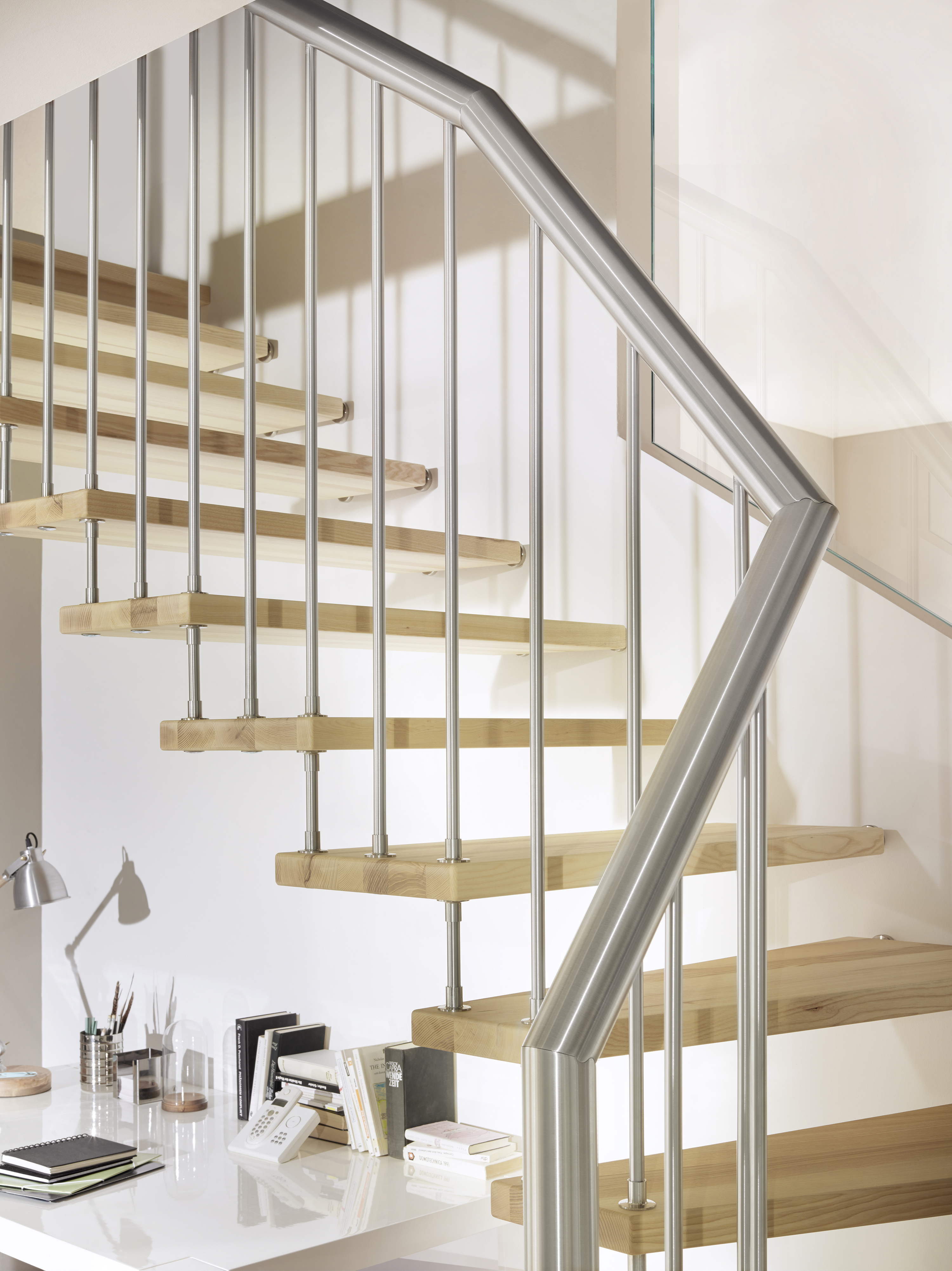 Die Stufen der „Star“ sind aus Hartholz wie Esche, Buche oder Eiche gefertigt. Für den Handlauf wird geschliffener Edelstahl verwendet, der beim Greifen nicht glatter ist als ein geölter oder lackierter Holzhandlauf. Mit der „Star“ wird die Systemtreppen-Familie um eine Gestaltungsvariante reicher. Mit dem Handlauf aus Stahl lassen sich architektonische Verbindungen zum Wohnraum – beispielsweise zu den Türgriffen – schaffen. Und natürlich weist das neue Modell die gleichen Vorteile auf wie alle Systemtreppen. Sie lassen sich individuell an viele Grundrisse anpassen, denn sie können gerade oder gewendelt nach oben verlaufen.