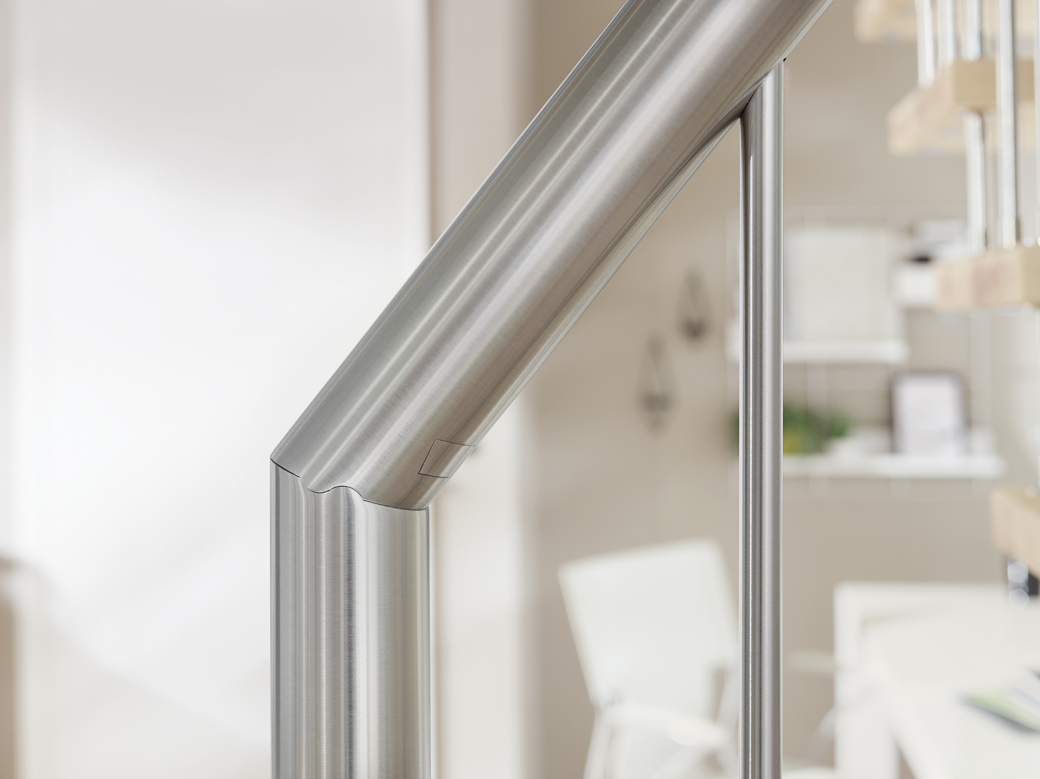 Holz und Edelstahl ist als reizvoller Materialmix im Trend. Auch bei Treppen bietet sich an, Stufen aus Holz mit einem Edelstahl-Handlauf zu kombinieren. Doch Konstrukteure stellt das mitunter vor Herausforderungen, vor allem bei freitragenden Modellen wie der Systemtreppe. Denn die Stufen sind bei diesem System nur an einer Seite mit Stahlbolzen in der Wand verankert. Deswegen kommt auch dem Geländer eine statische Funktion zu.