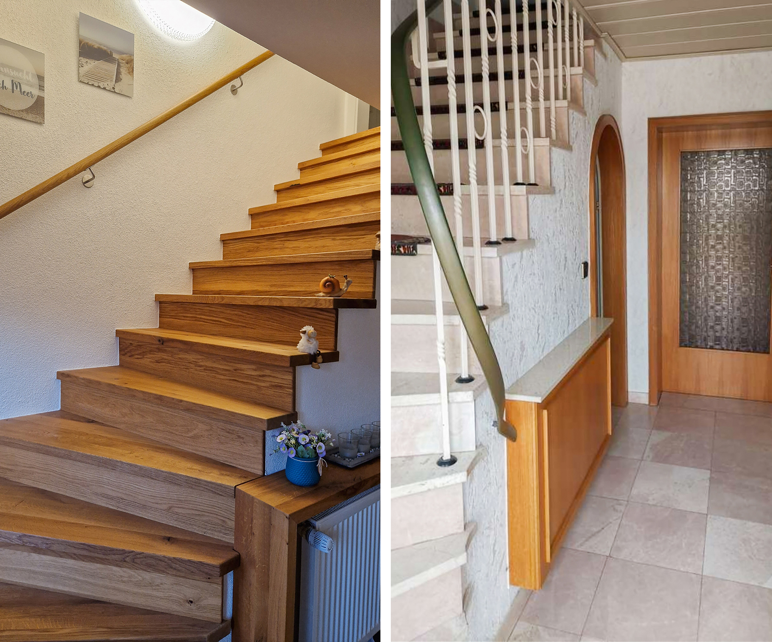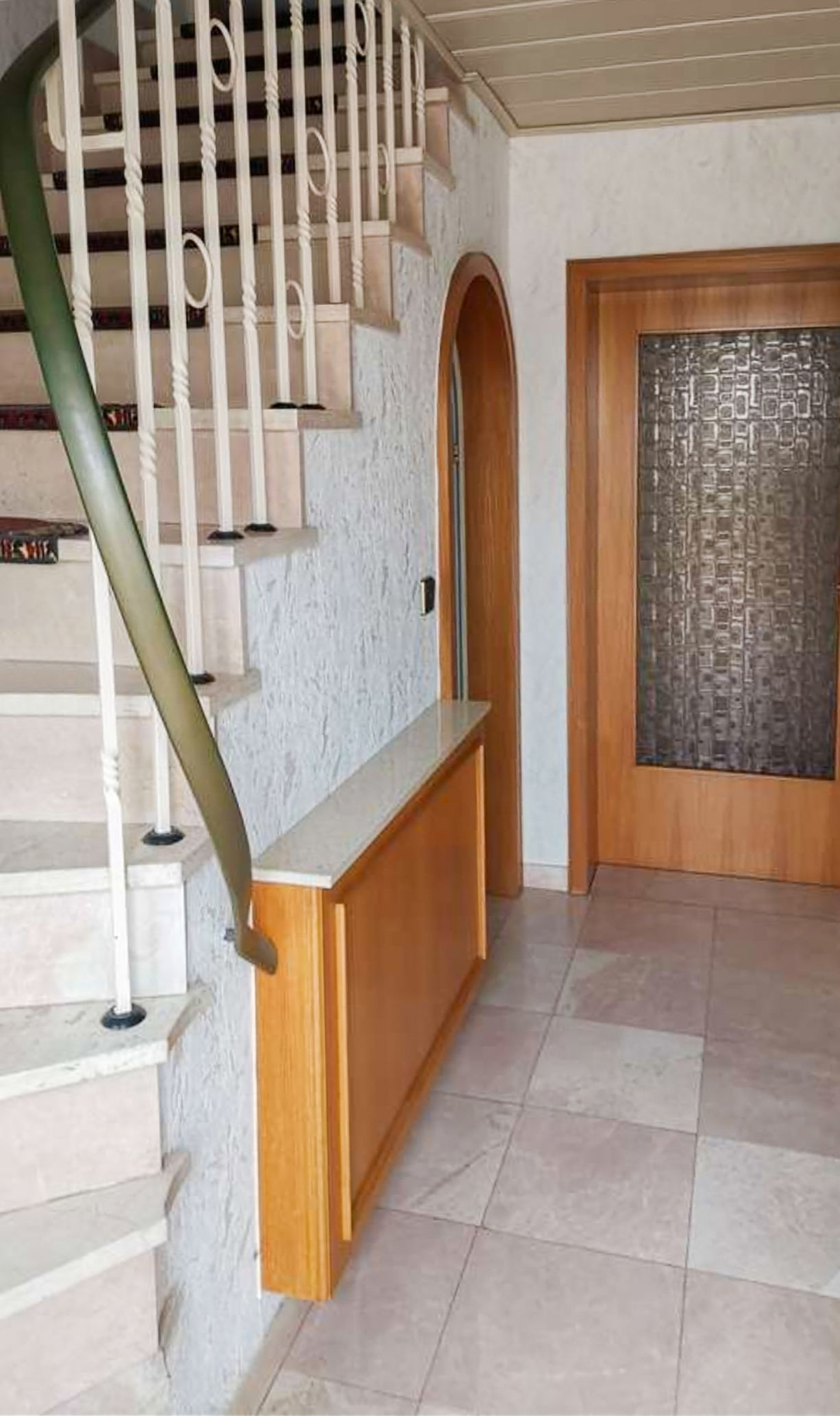Steintreppen aus Marmor oder in Marmoroptik waren in den 60er-Jahren der letzte Schrei, wirken heute jedoch nicht mehr zeitgemäß. Bei einem Einfamilienhaus, Baujahr 1963, waren auf der Treppe zudem noch Teppichfliesen aufgeklebt worden.