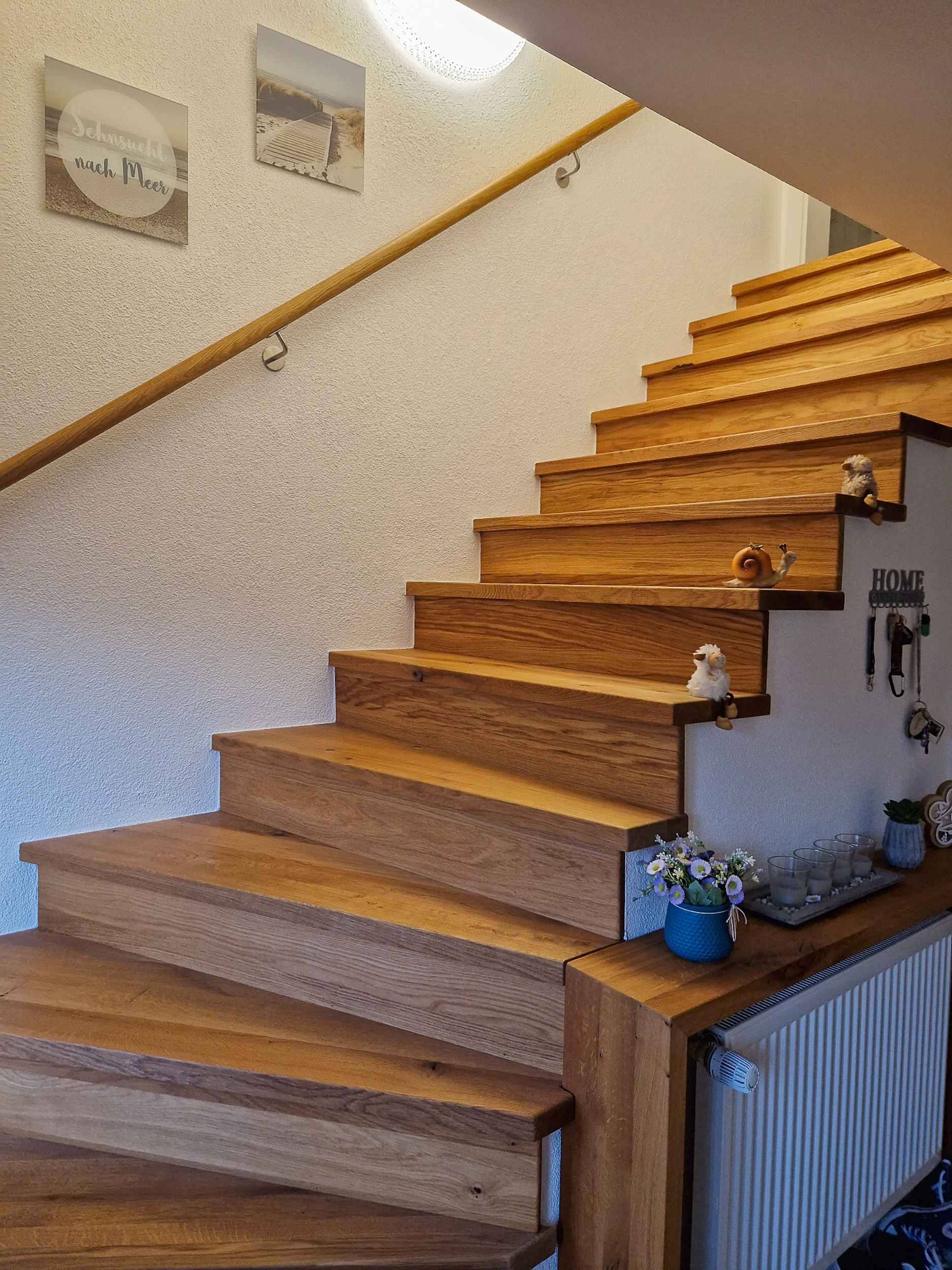 Für die neue Treppe entschied sich der Hausherr für einen Handlauf an der Wand: ein Rundholz mit einem Durchmesser von 45 Millimetern, ebenfalls aus geölter Eiche. Zum Flur hin ist die Treppe offen. Sogar der Heizkörper am Fuß der Treppe bekam eine passende Verkleidung aus Holz.