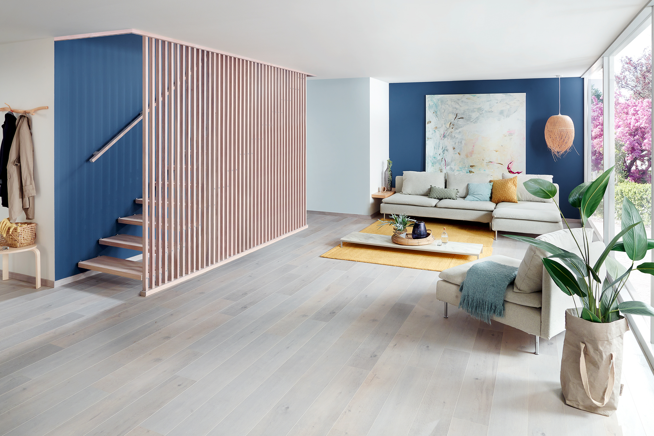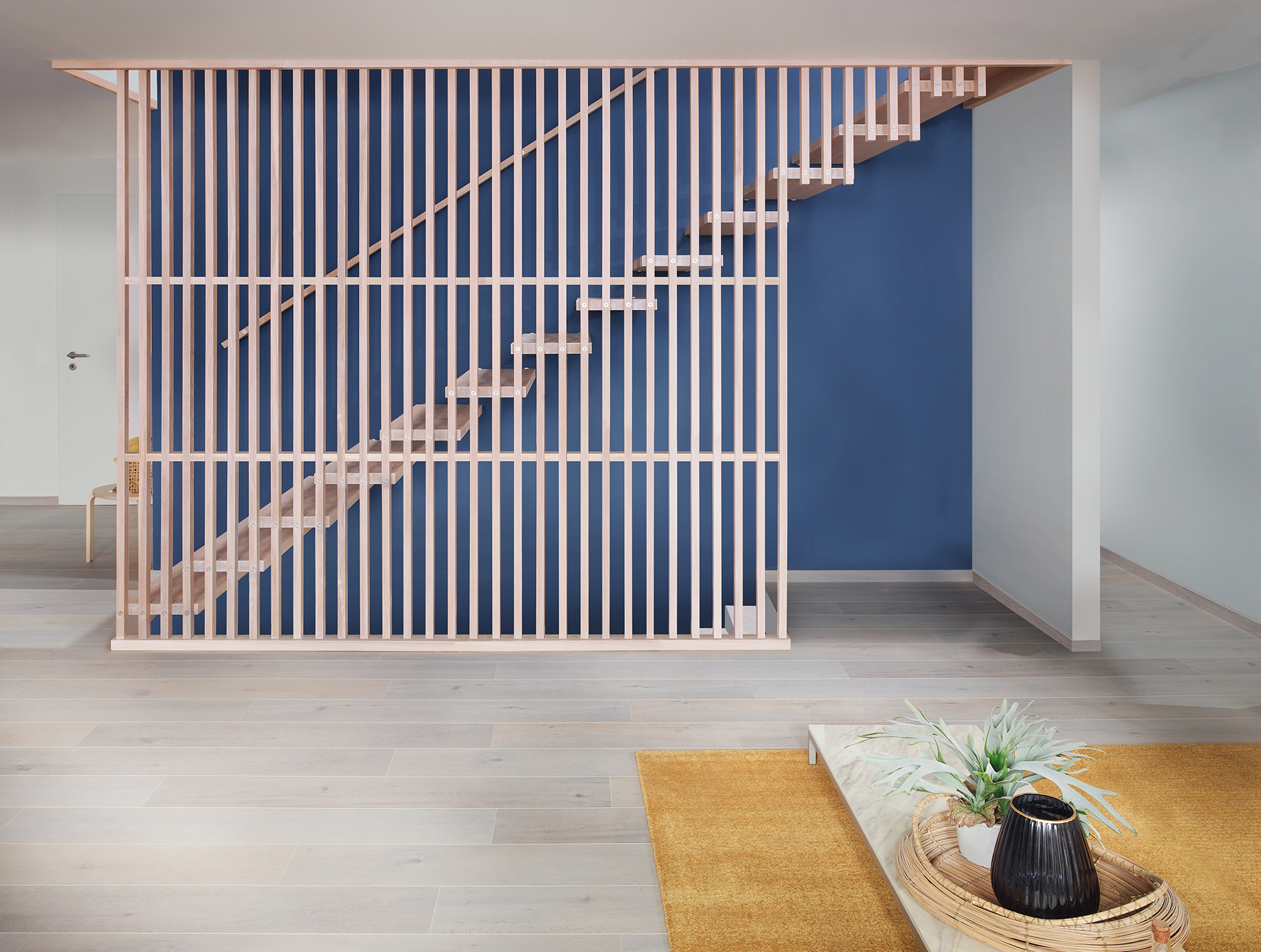 Im Raum selbst werden die Lamellen zum gestalterischen Element: Sie bilden eine eigene Wand, die für klare Linien und Strukturen sorgt. Die Länge der Bretter kann variieren: Wenn die Leisten gerade bis unter die Stufen reichen und sich farblich vom Hintergrund abheben, ergibt sich optisch ein attraktives Muster.