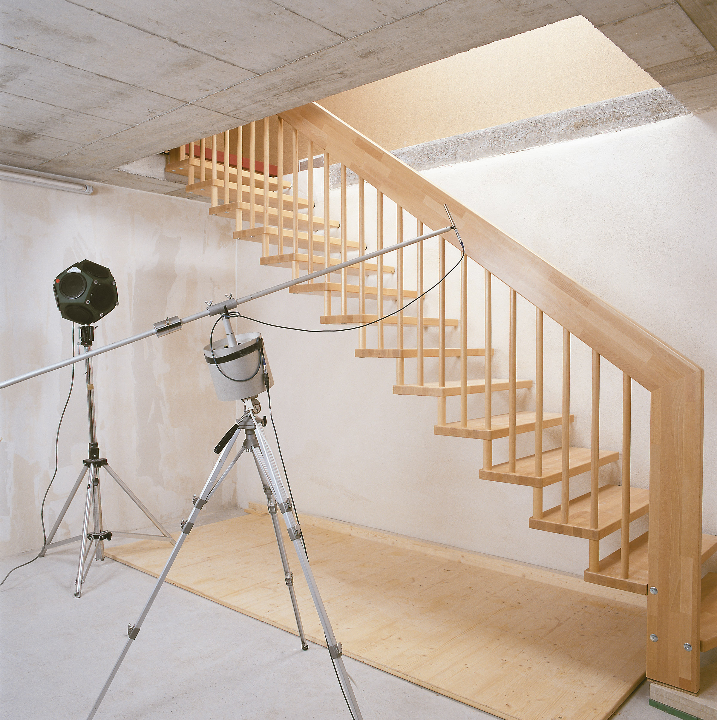 Allerdings ist die Berechnung, ob die geplante Treppe den neuen Anforderungen entspricht, bauphysikalisch anspruchsvoll. Für Stahlbeton-Treppen gibt der Verein Deutscher Ingenieure (VDI) mit der Richtlinie 4100 ein geeignetes Rechenverfahren vor. Doch für leichte Konstruktionen wie Holztreppen existierte bislang nichts Vergleichbares. Um die Trittschall-Werte einzelner Modelle zu ermitteln, hat Treppenmeister einen Schallprüfstand für Holztreppen entwickelt und kann auf Grundlage dieser Ergebnisse nun einen Trittschallrechner anbieten. Damit ermitteln eigens dafür geschulte Fachleute, ob die Planung für ein Haus in diesem Punkt den neuen Bestimmungen entspricht. Zudem können so Empfehlungen gegeben werden, wie die Vorgaben am kostengünstigsten umzusetzen sind. Unter Umständen ist eine stärkere Wand weniger aufwendig als die Trittschalldämmung der Treppe.