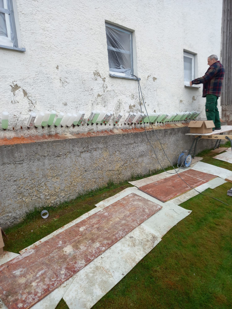 Das Haus freizulegen und abzudichten, wäre sehr aufwendig gewesen. Daher erfolgte die Feuchtesanierung durch Einbringen einer nachträglichen Veinal Horizontalsperre als Querschnittsabdichtung. So wurden ca. 40 lfm Mauerwerk trockengelegt. Von außen wurde über Bohrlöcher eine niederviskose, kriechfähige Silikonharzlösung ins Mauerwerk injiziert. Sie reagiert mit der Feuchtigkeit und bildet nach ein bis zwei Tagen eine porenauskleidende, unverrottbare Schicht aus polymerem Silikonharz. So wird schnell und ohne Freilegen der Wand eine neue Horizontalsperre eingebracht. Die darüber liegenden Mauerbereiche beginnen abzutrocknen. Bei sachgemäßer Ausführung liegt die Feuchtereduktion bei fast 100, im Mittel bei 99 Prozent – abhängig u.a. von der Ausgleichsfeuchtigkeit der verwendeten Baustoffe.