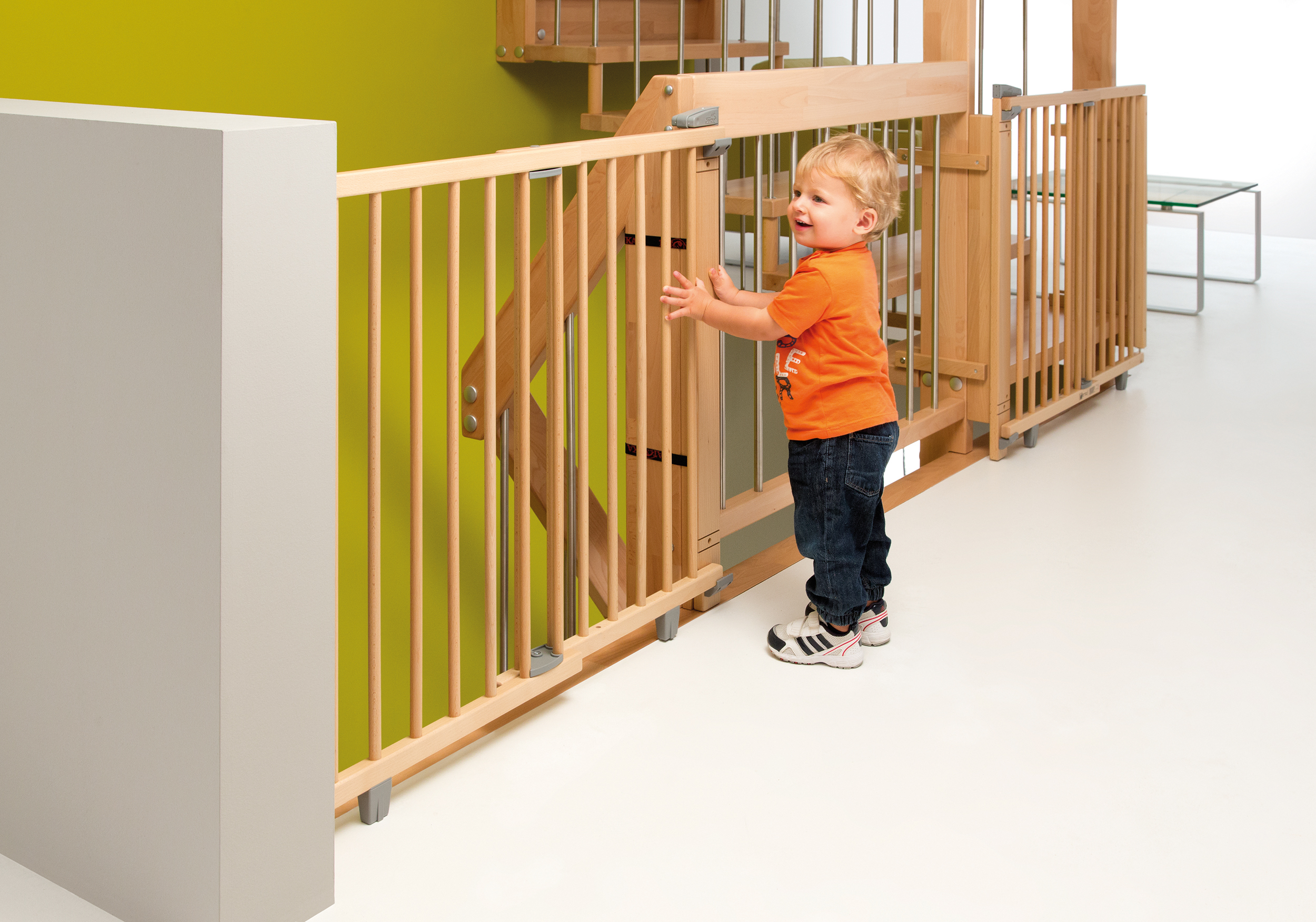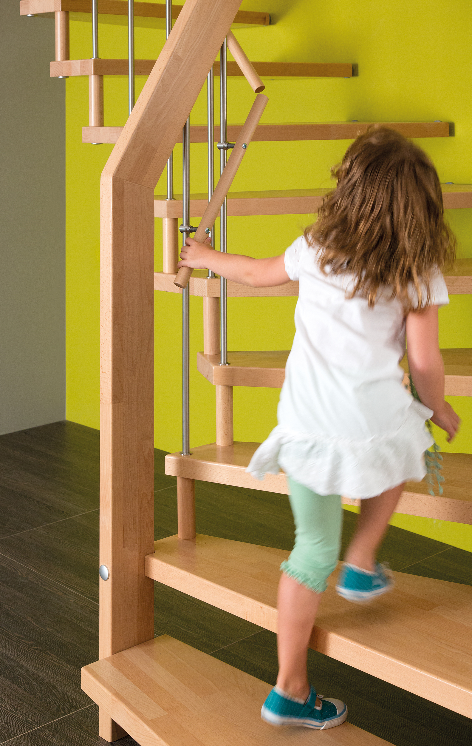 Auch für Kinder ist die Treppe eine Gefahrenquelle. Für Krabbelkinder sind Geländertüren ein Muss. Bei offenen Treppen sollte der Abstand zwischen den Stufen maximal zwölf Zentimeter betragen, damit Kleinkinder nicht dazwischen hindurchrutschen können. Als Sicherung lassen sich dann sogenannte Baurechtsleisten aus Holz oder Metall unter den einzelnen Stufen einziehen. Ein zweiter Handlauf mit kleinem Durchmesser auf halber individueller Höhe ist für Zwei- und Dreijährige gut zu umfassen und gibt auf der Treppe den nötigen Halt.